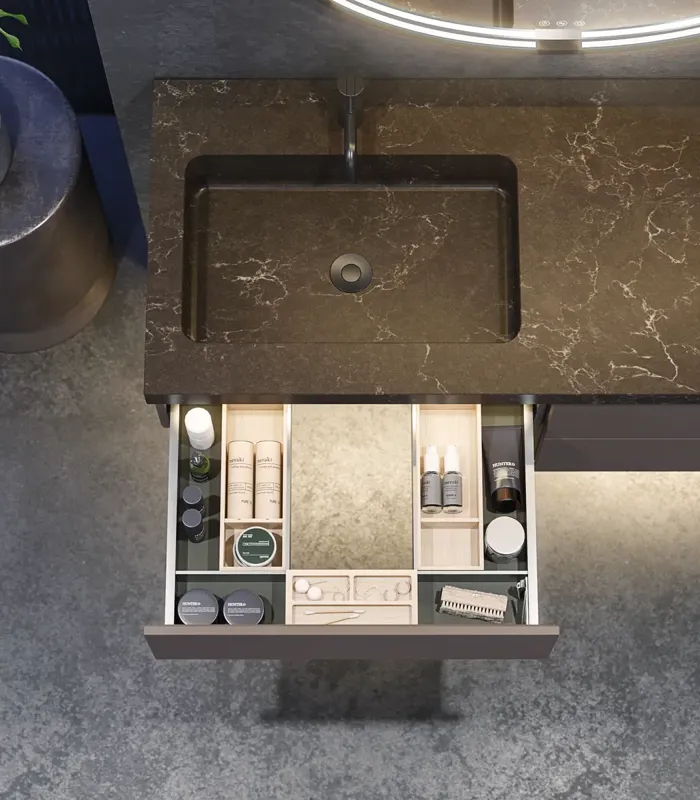 Som utgangspunkt har vi utelukkende fokus på løsninger som også overholder våre høye kvalitetsstandarder – fordi lang holdbarhet er et viktig element i et bærekraftig produkt. Derfor har vi 10 års garanti på alle møbler. I tillegg er det selvfølgelig også mulig å reparere eller skifte ut enkeltdeler, noe som kan forlenge møbelets levetid ytterligere. Det kan for eksempel være en elektronisk driver til lys i skuffen eller en skuffefront som er skadet.