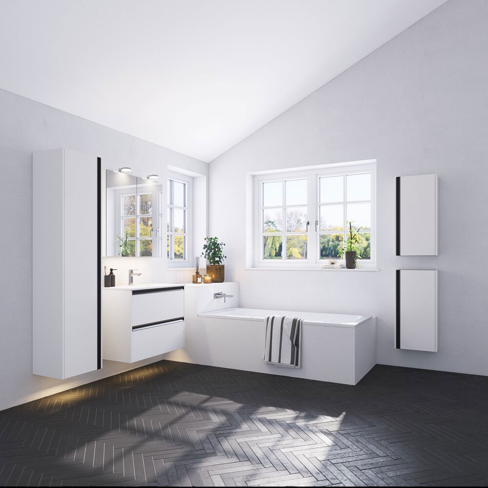 Du kan selvfølgelig også velge et baderomsskap som er bygget sammen med servanten og servantskapet. Har du for eksempel en asymmetrisk servantløsning, kan du få et baderomsskap ved siden av servantskapet i samme stil som servantskapet, slik at du får rikelig med oppbevaringsplass til hårføner, ekstra sjampo, vaskemidler og alt annet du trenger på badet. Du kan velge et baderomsskap med skuffer i samme stil som underskapet, eller du kan velge en annen løsning for et asymmetrisk og interessant uttrykk. Prøv et servantskap med 2 smale skuffer og deretter et sideskap med 1 stor skuff eller til og med en dør.