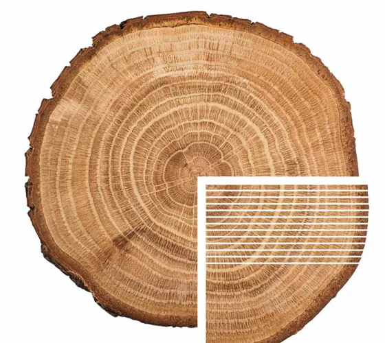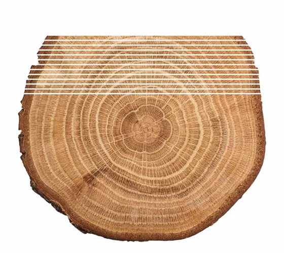 Vi har valgt å bruke eik – en vakker eikefinér med tydelige årringer og struktur. Det er en naturlig variasjon fra tre til tre og avhengig av om fineren ligger tettest på kjernen av stammen, eller barken og hvor treet har vokst. Treet trekker opp mineraler fra jorden, og disse avsetter seg som en mørk bunn i treets årringer, såkalte mineralstriper, som varierer ut fra hvor treet har vokst. Den naturlige variasjonen er en kvalitet, og nettopp det som skiller et naturprodukt fra de industrielle etterligningene som folie, laminat og melamin. Dette innebærer også at produkter som etterbestilles kan ha en avvikende farge, men fargeforskjellen vil bli redusert med tiden gjennom eksponering for sol.