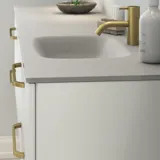 Det ultratynne kompositt-materialet har en matt hvit overflate. I motsetning til de ytre markant slanke og skarpe linjene, er servantens indre kjennetegn et mykt og rengjøringsvennlig design. Det tynne designet krever at servant og benkeplate understøttes av skap i full bredde.