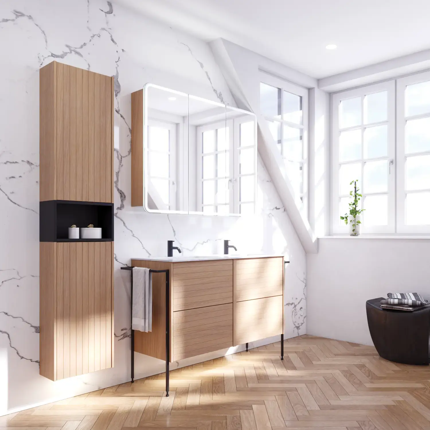 Til den plasskrevende familien, eller til deg som liker litt ekstra albuerom, er den doble porselensservanten en perfekt løsning som dobbelservant på det nye badet. Skuffer og skap leveres i mange forskjellige farger og overflater, fra minimalistiske nyanser til stemningsfulle trestrukturer. Alle skuffene har plassoptimerende rominndelere og innebygde dempere som sørger for at skuffene lukkes mykt.