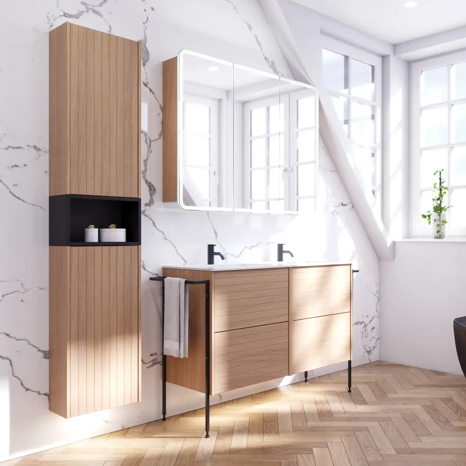 Vi elsker tre – fra helt lyse til helt mørke tresorter. Den nordiske, stilrene innredningen er lys og åpen med lyse og funksjonelle møbler og vakre, enkle detaljer. Ved å legge til tre i innredningen ledes tankene hen mot den skandinaviske rå naturen og gir liv til badet. Vi har trestruktur i flere av seriene våre, men Calidris skiller seg spesielt ut på dette området. Alle Calidris-elementene er finert med massive eikefinerkanter, og denne eikefinéren gir en jevnere kvalitet med vakrere åretegninger og struktur. Les mer om eikefiner i Calidris.