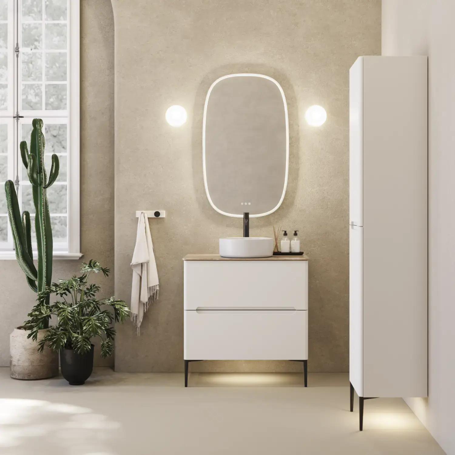 Når du starter din baderomsrenovering, kan du skape en stilren stemning og bringe naturen enda tettere på med noen få grønne planter og nedtonede farger som støtter seg på hverandre.