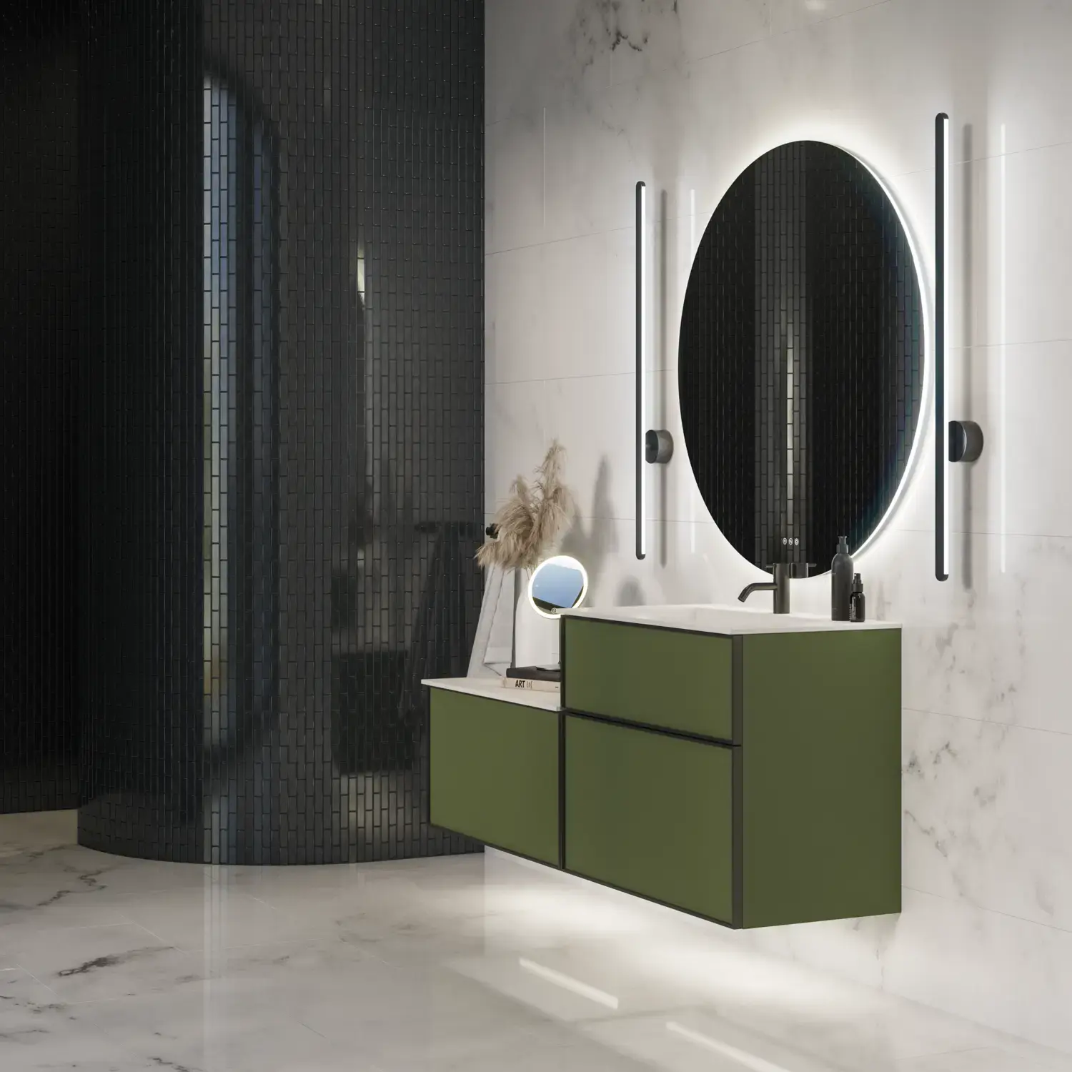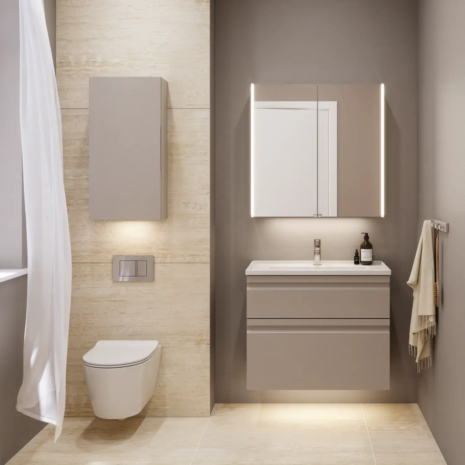 Du kan også bruke farger i samme nyanser når du skal i gang med din baderomsrenovering. Det gir et gjennomført, eksklusivt og samtidig rolig uttrykk når du har både veggene og baderomsmøblene dine i en tone-i-tone-palett. Denne luksuriøse effekten av tone-i-tone-paletter har også en evne til å få små områder til å virke større.