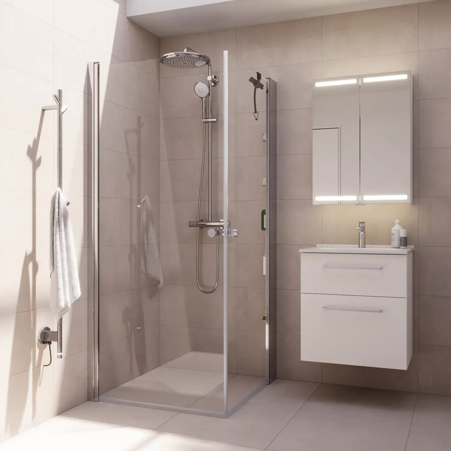 Tips: Utnytt veggene! Kombiner håndkletørkeren med vegghengte skap eller speilskap med oppbevaring for å frigjøre gulvplass og skape luft i rommet.