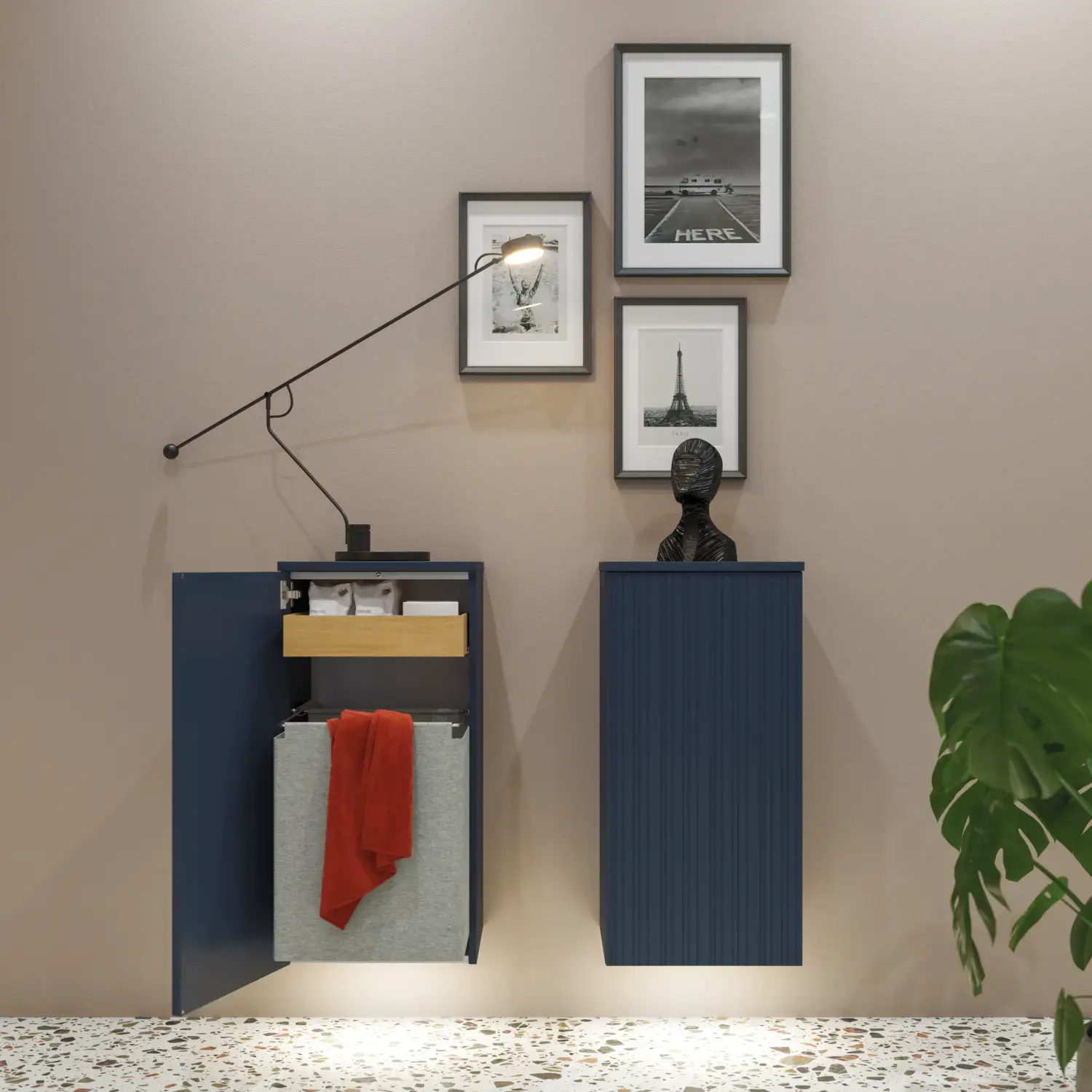 Underskapet utnytter plassen under en skråvegg eller et vindu perfekt, og gir deg god plass til håndklær og store sjampoflasker. Velg mellom A-innredningen for maksimal oppbevaring eller B-innredningen med en uttakbar treskuff og en praktisk skittentøypose.