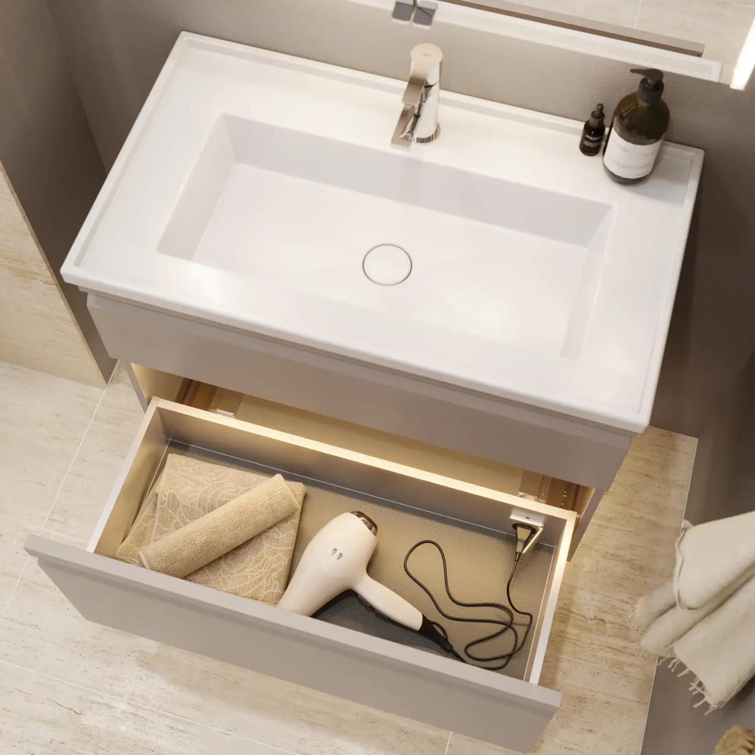 Det er enklere å la hårføneren eller rettetangen bli værende i stikkontakten fremfor å måtte rulle opp ledningen og pakke den pent bort etter bruk. Du skal jo uansett bruke den igjen i morgen tidlig. Gjør det enkelt for deg selv og innred med stikkontakter i skuffer og skap, da kan du oppbevare dine apparater der og unngå at tingene roter til på badet. Det er også praktisk når du skal lade tannbørster eller barbermaskin. Stikkontakt følger med når du bestiller skuffer med lys. Stikkontakt kan også kjøpes separat til plassering i skuffer og skap.