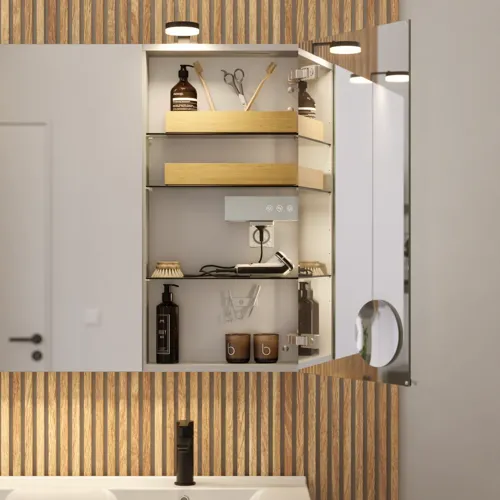 Mange av speilskapene våre har lysstyring, der du selv styrer lysets farge og styrke via et lite, integrert touchpanel på innsiden av speilskapet. På den måten blir ikke den naturlige døgnrytmen din forstyrret av et unødvendig skarpt og kaldt lys når du gjør deg klar til natten. Du demper bare lyset og stiller det inn på en varm tone. Når du skal våkne om morgenen kan du derimot tilpasse lyset i en kjøligere tone og øke lysstyrken.