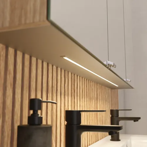 - Underlight – utvalgte speilskap kan leveres med en integrert LED-lysskinne på undersiden som gir et stemningsfullt lys ned over veggen og servanten.