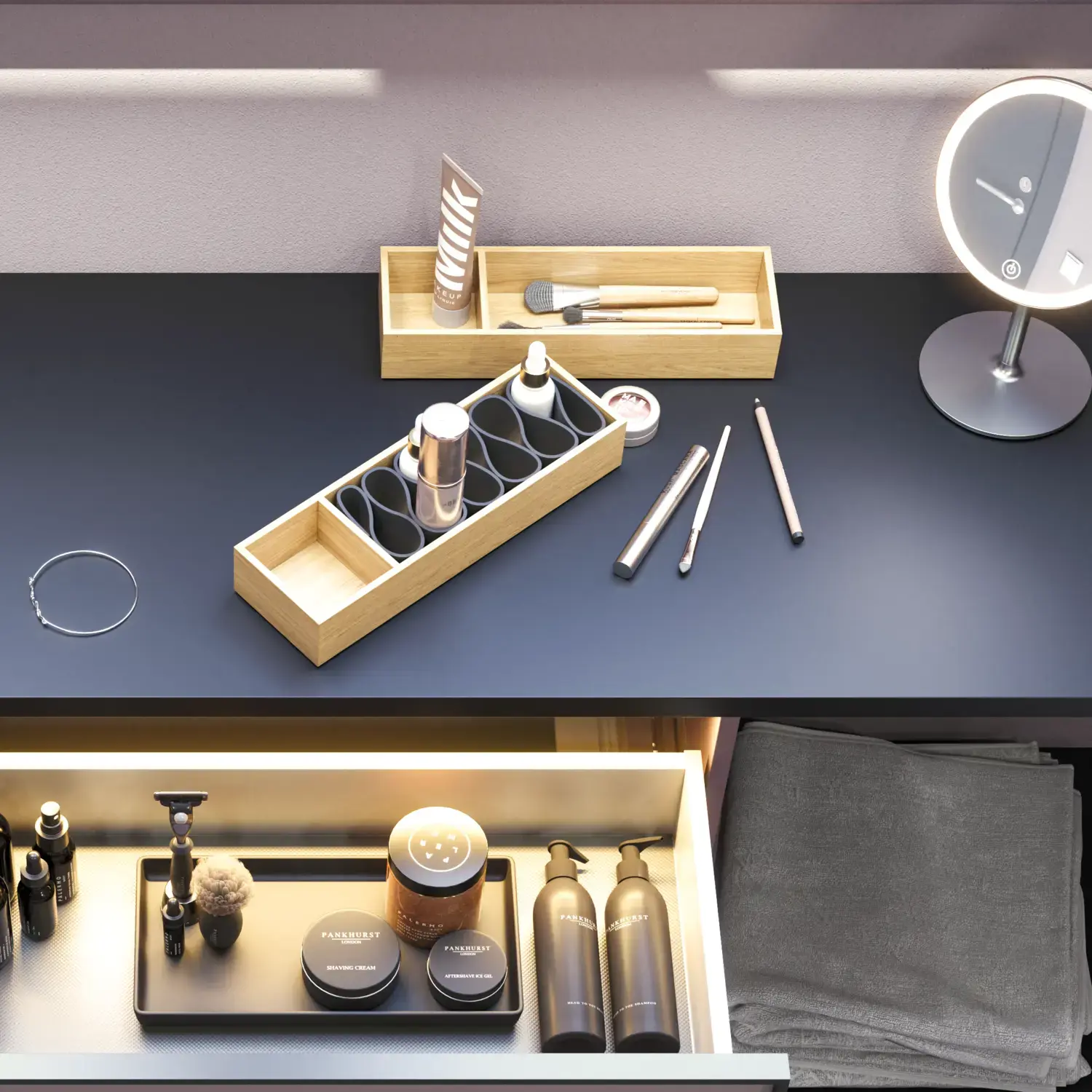 Morgenene flyter sÄ mye bedre nÄr alt har sin faste plass og du ikke behÞver Ä lete etter det du trenger. Derfor kan det lÞnne seg Ä innrede skuffer og skap optimalt. Som en baderomspesialist som kjenner vÄre kunders utfordringer, har vi utviklet en lang rekke funksjonelt tilbehÞr, som romdelere, flyttbare trebrett og innvendig lys til skuffer og skap, stikkontakter i speilskap og skuffer til elektriske apparater, skittentÞyskurv til hÞyskap og masse mer. Alt sammen bidrar til Ä gjÞre hverdagen din pÄ badet lettere.