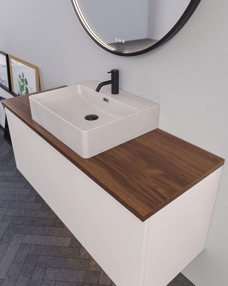 Laminatbenkeplater tilfører både funksjon og stil på badet. Med et design som passer perfekt til Dansani Inzos moderne estetikk, er benkeplater i laminat en slitesterk og praktisk overflate på badet. Laminat er kjent for å være motstandsdyktig mot slitasje, flekker og fuktighet, noe som gjør den ideell for badet. Laminatbenkeplate fås i en rekke dekor og teksturer som passer til din personlige smak og innredning.