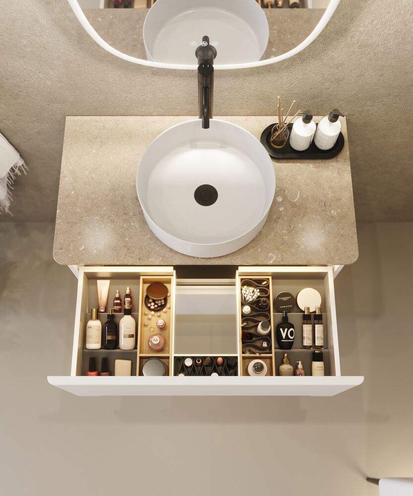 Silestone-benkeplater med avrundede hjørner kombinerer eksklusiv design med høy ytelse - og passer vakkert sammen med Vintage-serien med integrerte håndtak, der møblene også har de myke, avrundede formene. Resultatet er en harmonisk helhet på badet, der både møbel og benkeplate snakker samme designspråk. Overflaten er laget av naturlig kvarts gjennom en avansert teknologisk prosess, og er sterk, flekkavvisende og lett å vedlikeholde. Den harde, glatte overflaten gjør benkeplaten motstandsdyktig mot daglig slitasje, samtidig som den beholder sitt luksuriøse utseende i mange år. Silestone er tilgjengelig i et bredt spekter av farger og mønstre - fra klassisk, tidløs hvit til dristige nyanser - slik at du kan skape akkurat det uttrykket som passer din personlige stil. Uansett hva du velger, vil benkeplaten tilføre badet ditt et streif av eleganse og raffinement. Vær oppmerksom på at fargen på benkeplaten kan avvike fra bildet som vises. Vi anbefaler derfor at du ser en fysisk prøve hos en forhandler før du bestemmer deg.
