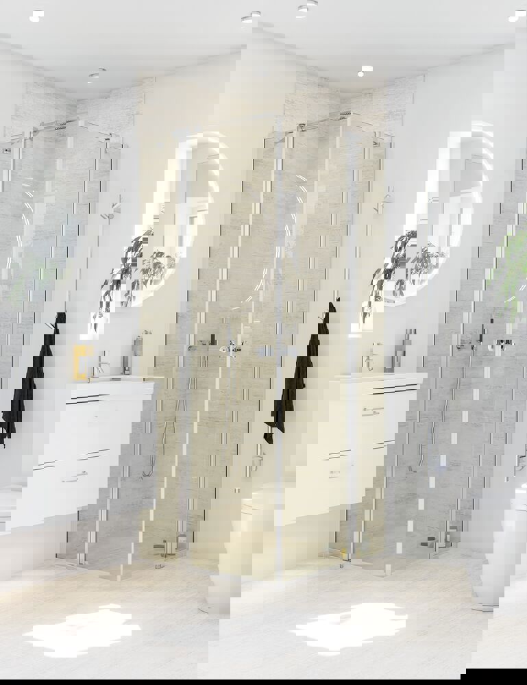 Denne svingdør med sidepanel gir en stabil og elegant avskjerming rundt dusjen, minimerer vannsøl og skaper en følelse av privatliv. Du kan møblere nært dusjhjørnet, noe som er praktisk hvis du har begrenset plass. Den innebygde svingdøren kan skyves inn uten å treffe blandebatteriet når du ikke bruker dusjen, noe som gir deg mer plass på badet. Glasset er laget av herdet sikkerhetsglass og behandlet med EasyCare, som sikrer lang holdbarhet og sikkerhet. Med Dansanis svingdør med sidepanel får du både en elegant og funksjonell løsning til badet ditt.