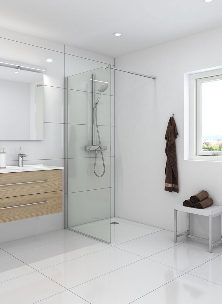 Fastveggen er designet med fokus på å skape et romslig og stilrent dusjområde som kan tilpasses din personlige stil og baderomsinnredning. Våre fastvegger kan kombineres med andre dusjvegger eller dusjdører, noe som gir deg muligheten til å skape en løsning som passer perfekt inn på badet ditt. Kanskje har du god plass og kan lage et dusjkabinett? Eller kanskje du vil kombinere fastveggen med en svingdør for en stabil og sikker løsning? Uansett hva du velger, kan du finne den løsningen som passer deg best. Glasset i fastveggen er behandlet med EasyCare, et spesialbelegg som avviser vann og såperester og som gjør rengjøringen mye enklere. Glasset er også herdet, den sterke konstruksjonen og det solide materialet sørger for at veggene er stabile og pålitelige.
