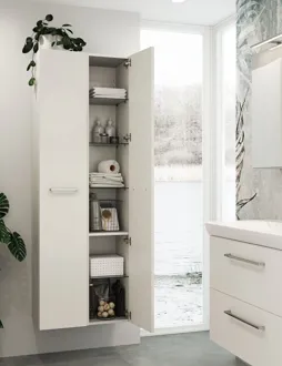 Skap eleganse og funksjonalitet på badet med dette Dansani Mido+ høyskapet. Høyskapet gir deg masse ekstra oppbevaringsplass på badet, og i dette skapet finner du 1 trehylle og 4 flotte glasshyller. Et høyskap er en god løsning hvis du trenger ekstra oppbevaringsplass på badet, og her får du en løsning som samtidig skaper en følelse av luksus på badet. Med flott dansk design og smarte oppbevaringsmuligheter er dette høyskapet et perfekt tilvalg til ethvert stilrent bad.