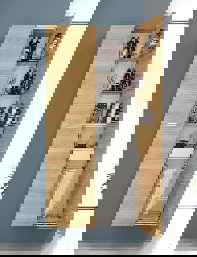 Utnytt hver centimeter av plassen på badet med Dansani Mido+ høyskap. Med et høyskap får du plass til alle baderomsartiklene dine. Har du plass anbefaler vi absolutt et høyskap til badet ditt. I dette høyskapet finner du 1 trehylle, 4 glasshyller og 3 hyller på døren, noe som gir deg god plass og mulighet til å optimalisere badet. Opplev en ny dimensjon av orden og design på badet med Dansani Mido+ høyskap.