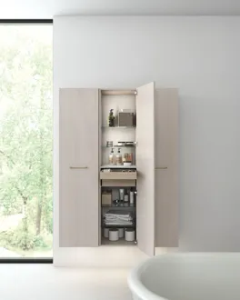 Baderomsoppbevaring blir enkelt og stilig med Dansani Calidris høyskap. Disse skapene er ikke bare et praktisk element, men også en estetisk fornøyelse som passer perfekt til det moderne baderomsinteriøret. Calidris høyskap har smarte hyller og rom som gjør det mulig å organisere alt fra håndklær og toalettsaker til skjønnhetsprodukter på en oversiktlig måte. Høyskapenes elegante design og rene linjer gir en følelse av orden og harmoni i bademiljøet. OBS: Det tilkommer en oppstartstillegg (BI1) pr. eik og valgfri farge. Det betales én gang per eik og valgfri farge, uansettav antall produkter. Husk å tilføre baderomsmøbelet de små praktiske tingene som du har glede av i hverdagen. For eksempel lys i skuffer og skap, innebygde stikkontakter og dempede sensorlamper under møblene som hjelper deg når du er på badet om natten. Tilvalg bestilles samtidig med møblene dine.