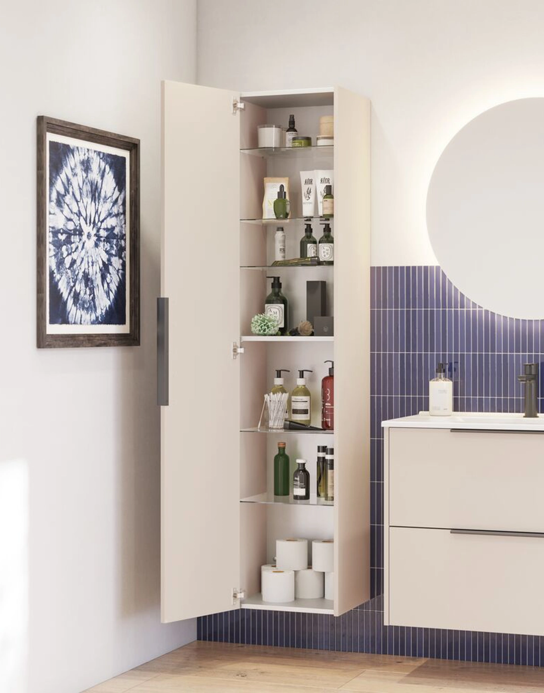 Dette høyskapet er designet for fleksibilitet og romslighet. Med en vendbar dør kan du tilpasse skapet til innredningen din, uansett hvilken retning du foretrekker. Innvendig finner du en solid trehylle og fire flyttbare glasshyller, noe som gir deg mange oppbevaringsmuligheter. Skapet er tilgjengelig i hvitt, sandfarget eller lyseblått, og håndtaket er montert slik at skapet er klart til bruk.