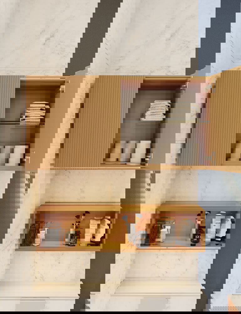 Innvendig LED lys (IP21) samt LED lys under reol inkl. bevegelsessensor (IP44) samt trådløs lysstyring (IP44) OBS: Krever speilløsning med tilvalg trådløs lysstyring. Du har mulighet til å samle speil, taklamper og spotter i en gruppe, så alt kan styres med kun ett enkelt trykk. Dermed vil en justering av speillyset også justere styrken og fargen på lyset i spotter og taklamper