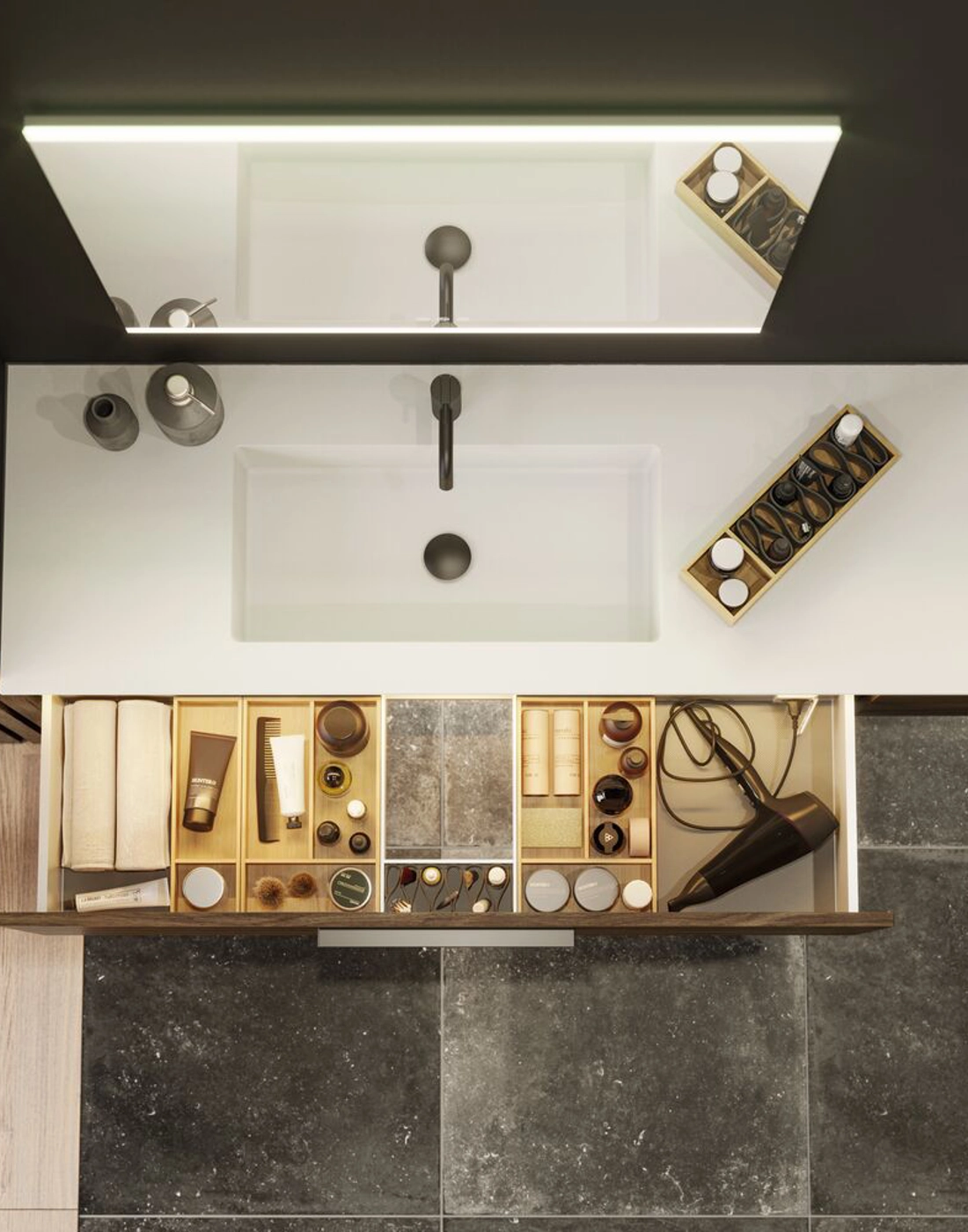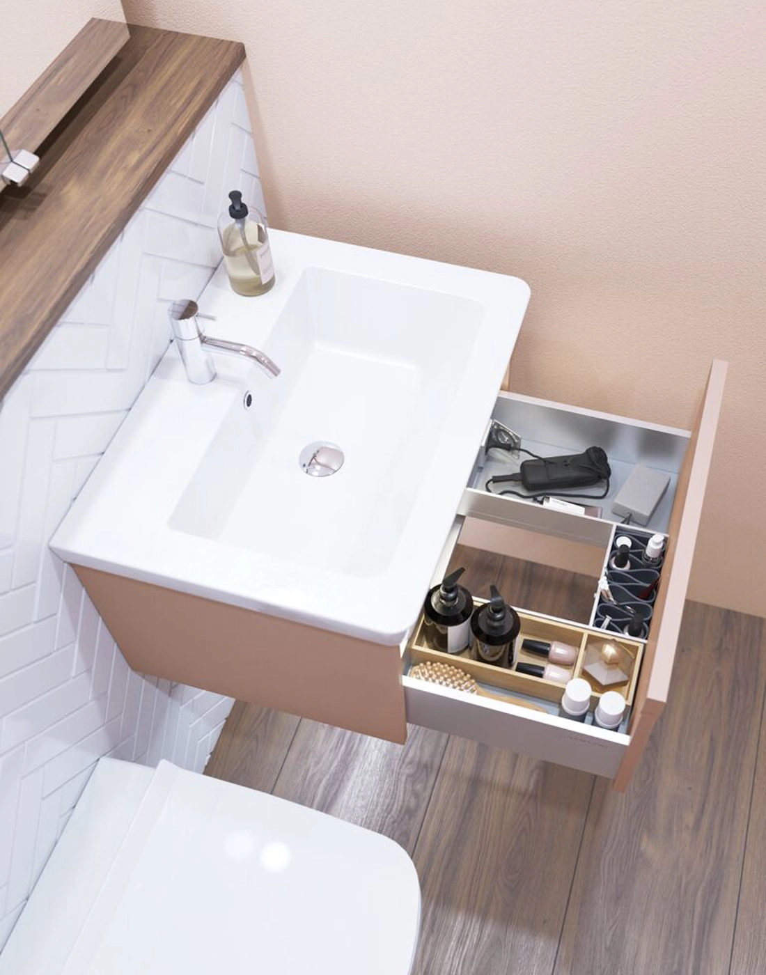 Oppbevaringsboks i eik til øverste skuff i servantskapet. Passer til servantskap i dybde 44 cm