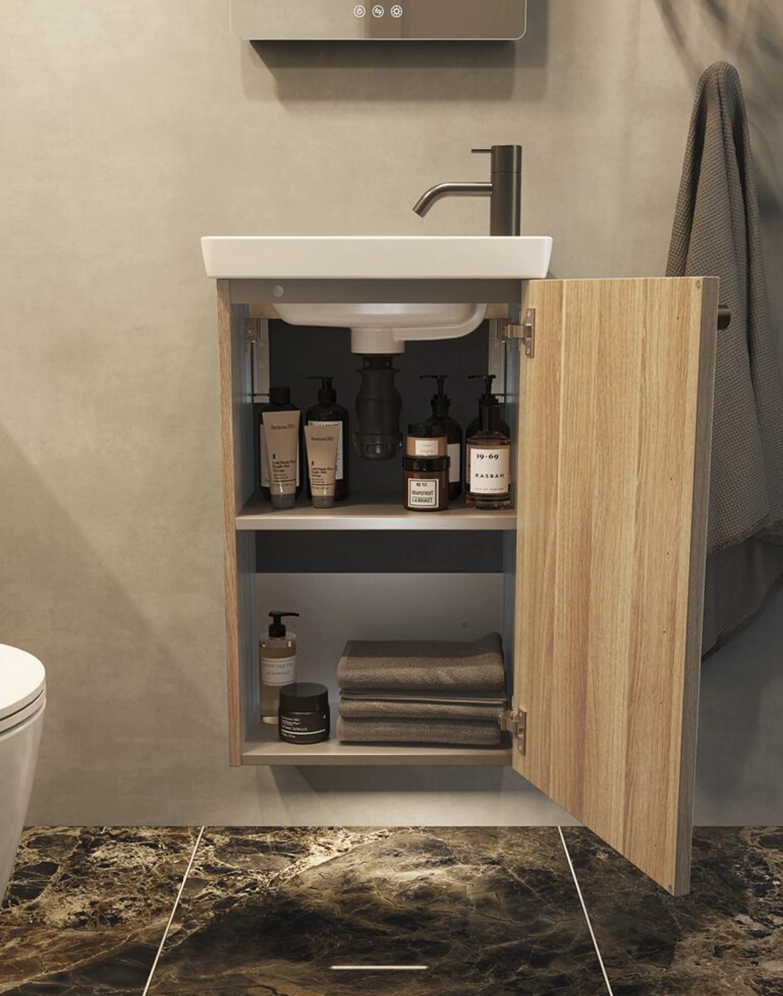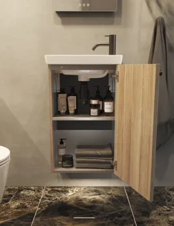 Dette servantskap med 1 dør er den ideelle løsningen for små bad. Med en dybde på kun 26 cm tar det minimalt med plass, og du får likevel et skap med praktisk oppbevaring. Den stilrene designen passer perfekt til ethvert interiør. Servantskapet er både funksjonelt og estetisk tiltalende og bidrar til å skape orden og eleganse på badet. Oppgrader badet med et servantskap og nyt den smarte, plassbesparende løsningen. OBS: Det tilkommer en oppstartstillegg (BI1) for produkter med valgfri farge. Det betales én gang per valgfri farge, uansettav antall produkter. Husk å tilføre baderomsmøbelet de små praktiske tingene som du har glede av i hverdagen. For eksempel lys i skuffer og skap, innebygde stikkontakter og dempede sensorlamper under møblene som hjelper deg når du er på badet om natten. Tilvalg bestilles samtidig med møblene dine.