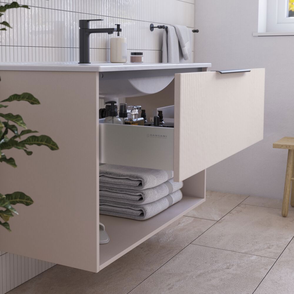 Dette servantskapet kombinerer det beste fra to verdener: en praktisk skuff, en åpen plass til å vise frem favorittsakene dine og en stripete front som gir et unikt og elegant utseende. Velg mellom fargene hvit, sand eller lyseblå for å finne den som passer best til ditt bad. Håndtaket er allerede montert, så den er klar til bruk.