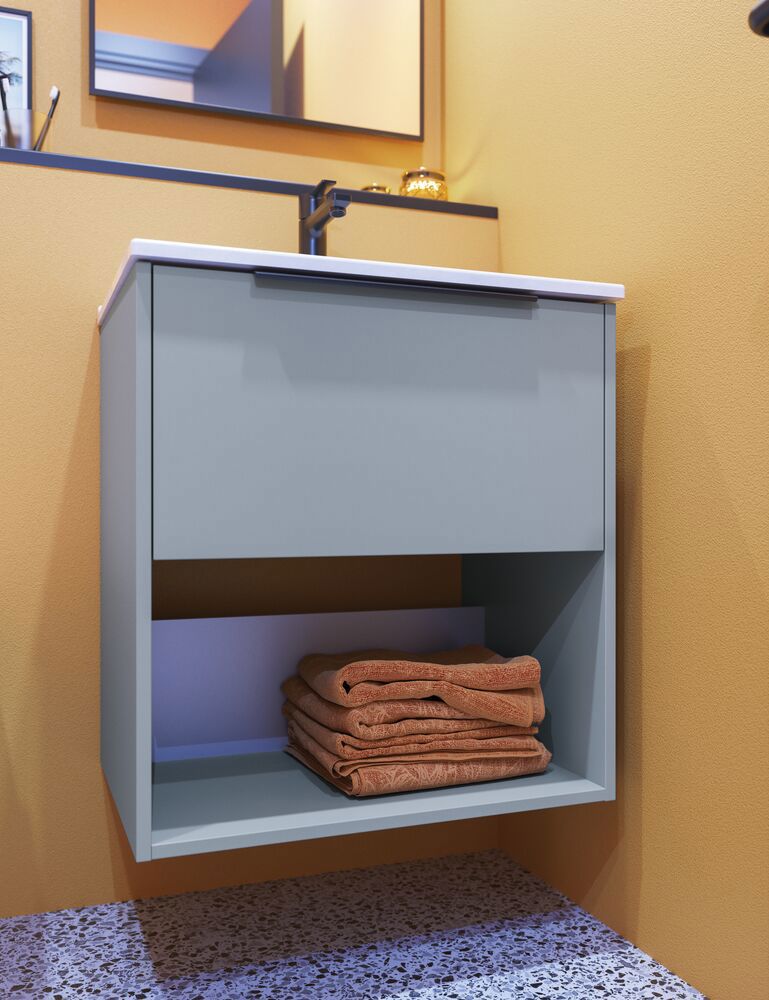 Oppdag den perfekte balansen mellom funksjonalitet og estetikk med Dansani Mido+ servantskap med 1 skuff - her i 44 cm dybde. Servantskapet er perfekt for mindre bad der det er trangt om plassen, men der du ikke vil gå på akkord med stilen. Med smart oppbevaring og et elegant minimalistisk design passer servantskapet inn i ethvert moderne interiør. Alle Mido+-skap leveres med det klassiske Base-håndtaket i krom. Du kan velge et annet håndtak for et annet utseende, men husk at det må bestilles sammen med møblene dine. Husk å tilføre baderomsmøbelet de små praktiske tingene som du har glede av i hverdagen. For eksempel lys og trebrett til skuffene dine.
