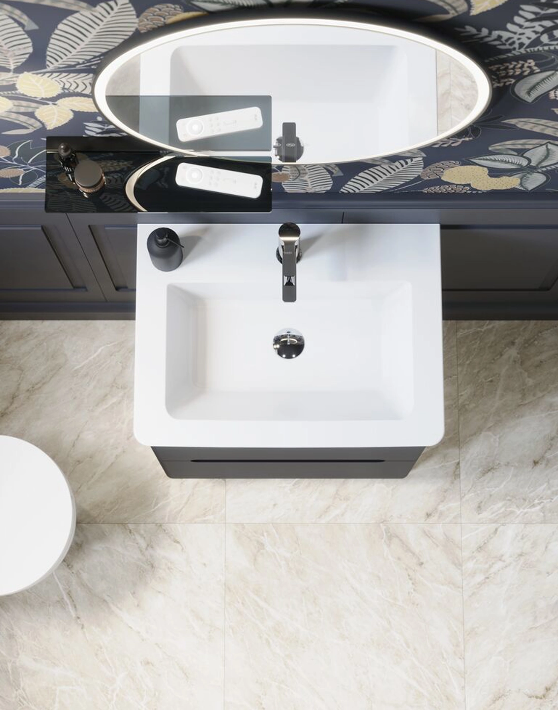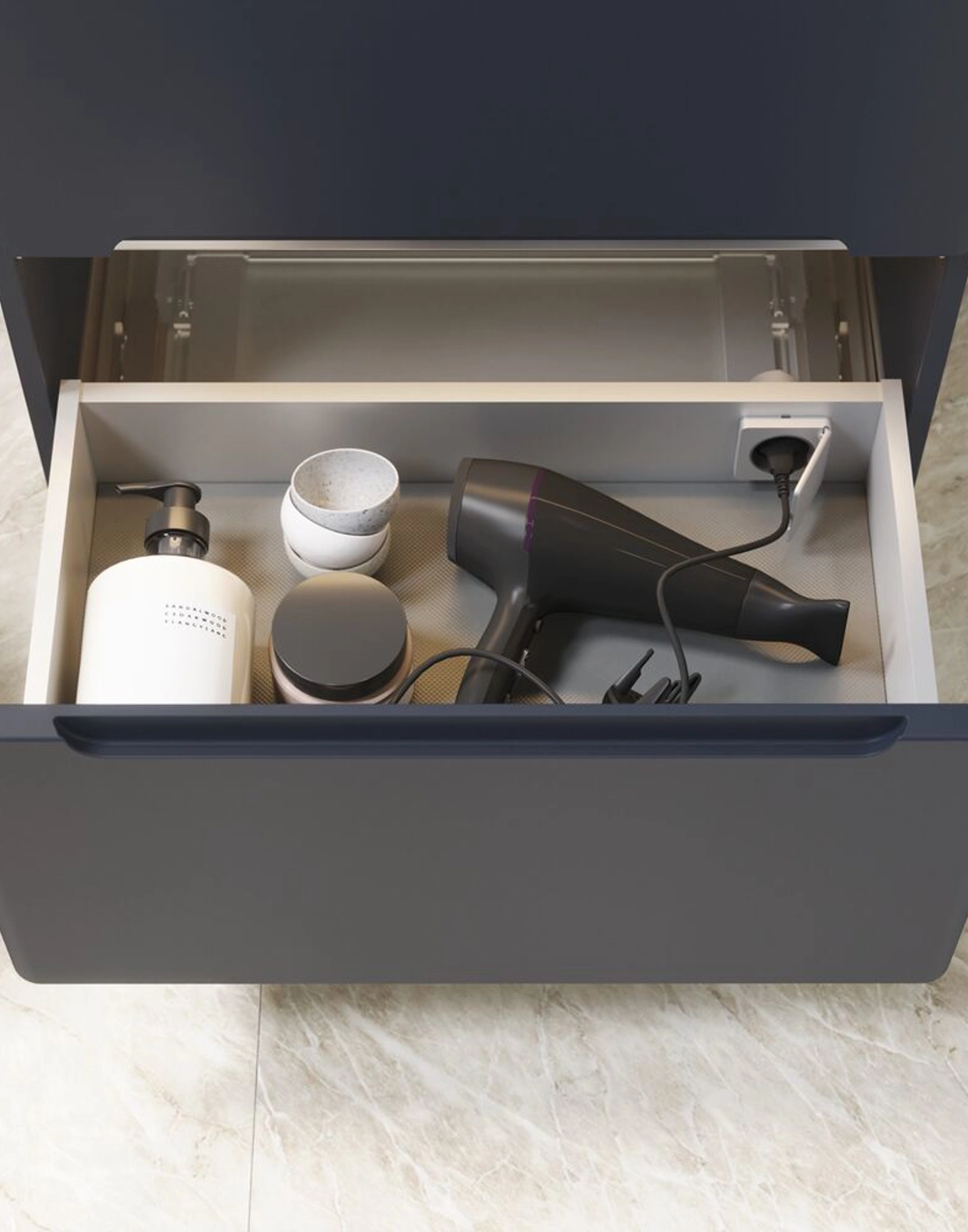 Forsterk badet ditt med et elegant servantskap som kombinerer myke, avrundede former med et strømlinjeformet uttrykk – perfekt for en feminin vintage-look. Den moderne fronten bevarer sjarmen og enkelheten fra klassiske kommoder, og skaper en tidløs atmosfære med et snev av eleganse. De integrerte håndtakene i skapfronten understreker det minimalistiske designet, mens du kan velge mellom en ren hvit farge eller en unik nyanse som passer perfekt inn i din personlige stil. Som en ekstra detalj kan skapet fås med dekorative svarte ben, som gir badet et lett og luftig uttrykk. OBS: Det tilkommer en oppstartstillegg (BI1) for produkter med valgfri farge. Det betales én gang per valgfri farge, uansettav antall produkter. Husk å tilføre baderomsmøbelet de små praktiske tingene som du har glede av i hverdagen. For eksempel lys i skuffer og skap, innebygde stikkontakter og dempede sensorlamper under møblene som hjelper deg når du er på badet om natten. Tilvalg bestilles samtidig med møblene dine.