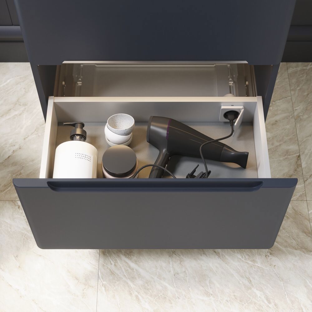 Forsterk badet ditt med et elegant servantskap som kombinerer myke, avrundede former med et strømlinjeformet uttrykk – perfekt for en feminin vintage-look. Den moderne fronten bevarer sjarmen og enkelheten fra klassiske kommoder, og skaper en tidløs atmosfære med et snev av eleganse. De integrerte håndtakene i skapfronten understreker det minimalistiske designet, mens du kan velge mellom en ren hvit farge eller en unik nyanse som passer perfekt inn i din personlige stil. Som en ekstra detalj kan skapet fås med dekorative svarte ben, som gir badet et lett og luftig uttrykk. OBS: Det tilkommer en oppstartstillegg (BI1) for produkter med valgfri farge. Det betales én gang per valgfri farge, uansettav antall produkter. Husk å tilføre baderomsmøbelet de små praktiske tingene som du har glede av i hverdagen. For eksempel lys i skuffer og skap, innebygde stikkontakter og dempede sensorlamper under møblene som hjelper deg når du er på badet om natten. Tilvalg bestilles samtidig med møblene dine.