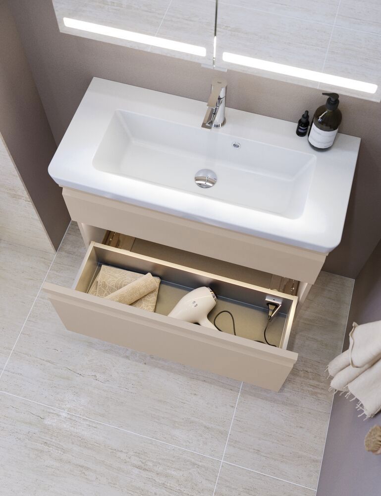 Dette servantskap med skuffer er den ideelle løsningen for badet ditt. Med en dybde på bare 35 cm er det perfekt for mindre rom. Den høye bunndrageren gir ekstra lagringsplass til større badeartikler, slik at du enkelt kan holde orden. Med det integrerte grepet får du både funksjonalitet og et stilrent design som gjør det mulig å organisere tingene dine elegant og praktisk. OBS: Det tilkommer en oppstartstillegg (BI1) for produkter med valgfri farge. Det betales én gang per valgfri farge, uansettav antall produkter. Husk å tilføre baderomsmøbelet de små praktiske tingene som du har glede av i hverdagen. For eksempel lys i skuffer og skap, innebygde stikkontakter og dempede sensorlamper under møblene som hjelper deg når du er på badet om natten. Tilvalg bestilles samtidig med møblene dine.