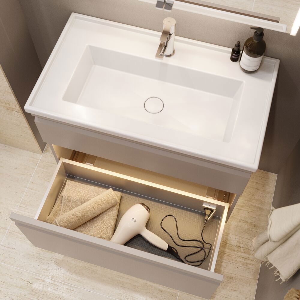 Skap en unik stil på badet ditt med servantskapet med lamelfront. De to skuffene, hver 32 cm høye, gir deg optimal oppbevaringsplass for å holde orden på badeproduktene dine. Lamelfronten gir et karakteristisk og moderne utseende som skiller seg ut og tilfører rommet personlighet. Dette skapet kombinerer funksjonalitet med estetikk og er den ideelle løsningen for de som ønsker å gjøre badet både praktisk og stilig. Husk å tilføre baderomsmøbelet de små praktiske tingene som du har glede av i hverdagen. For eksempel lys i skuffer og skap, innebygde stikkontakter og dempede sensorlamper under møblene som hjelper deg når du er på badet om natten. Tilvalg bestilles samtidig med møblene dine.