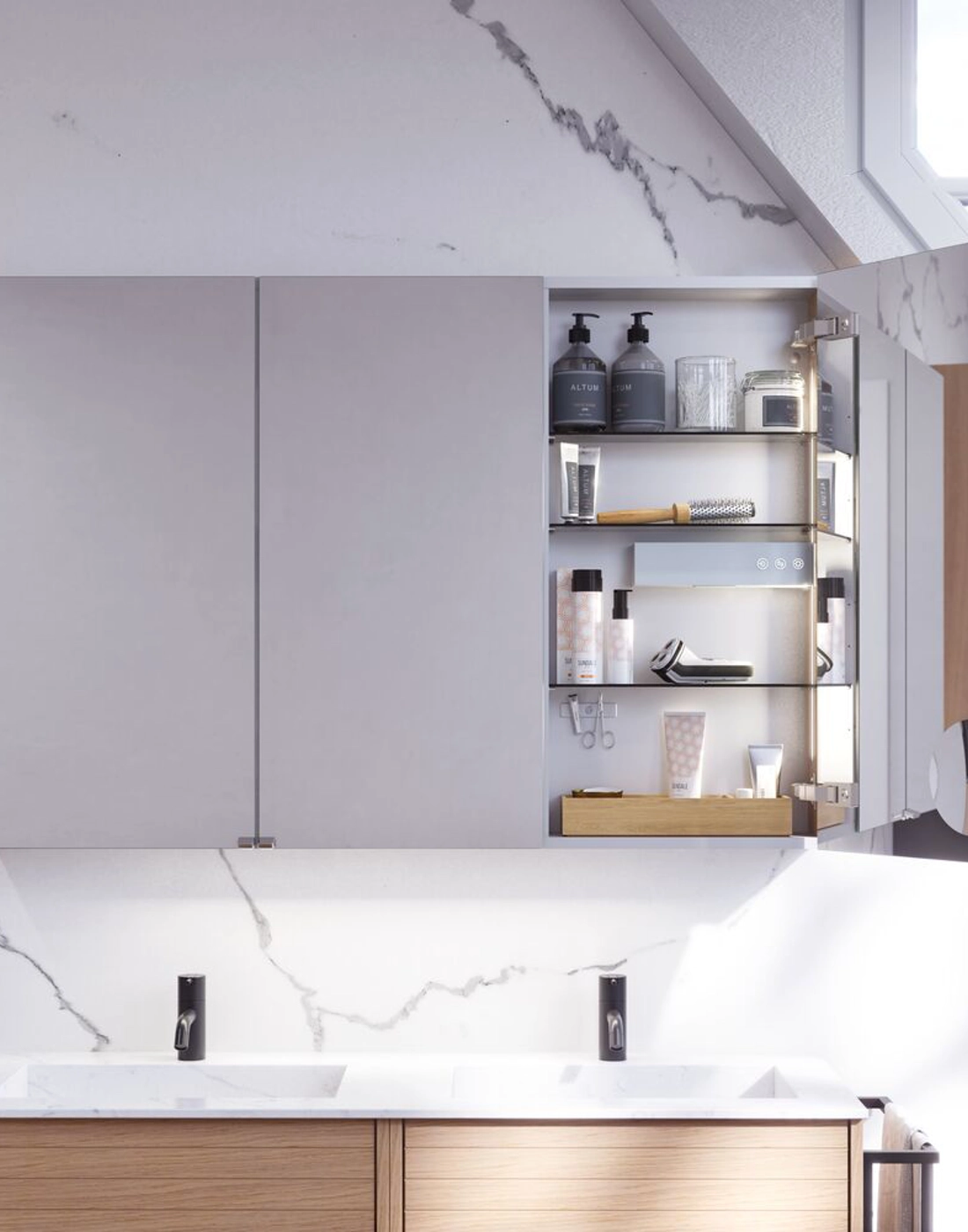Få praktisk oppbevaring og stilig design med Style speilskap. Speilskapet er perfekt for oppbevaring av kremer, deodorant, negleklippere, tannbørster og mye mer. Legg til lamper til speilskapet og styr lysets temperatur og styrke med et enkelt trykk. Det vakre speilskapet har magnetisk skinne, metallhylle, forstørrelsesspeil og strømuttak, noe som gjør morgen- og kveldsrutinene dine mye enklere. OBS: Det tilkommer en oppstartstillegg (BI1) for produkter med valgfri farge. Det betales én gang per valgfri farge, uansettav antall produkter.