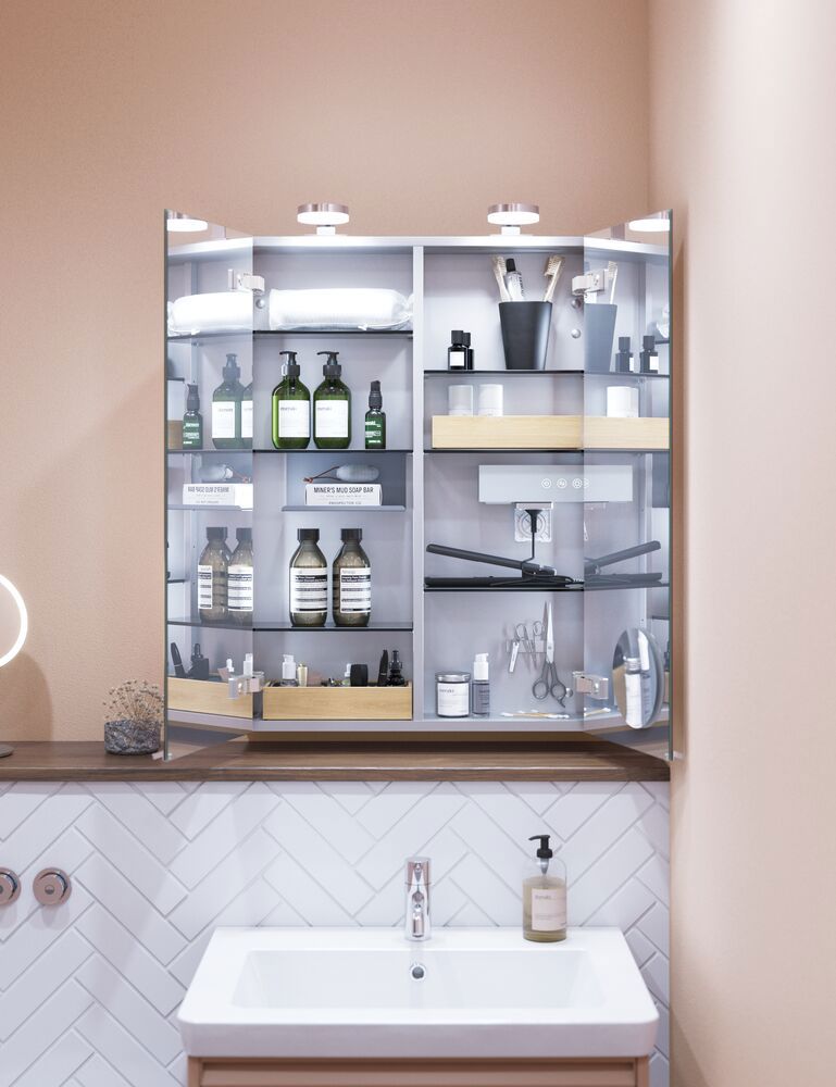 Få praktisk oppbevaring og stilig design med Style speilskap. Speilskapet er perfekt for oppbevaring av kremer, deodorant, negleklippere, tannbørster og mye mer. Legg til lamper til speilskapet og styr lysets temperatur og styrke med et enkelt trykk. Det vakre speilskapet har magnetisk skinne, metallhylle, forstørrelsesspeil og strømuttak, noe som gjør morgen- og kveldsrutinene dine mye enklere. OBS: Det tilkommer en oppstartstillegg (BI1) for produkter med valgfri farge. Det betales én gang per valgfri farge, uansettav antall produkter.