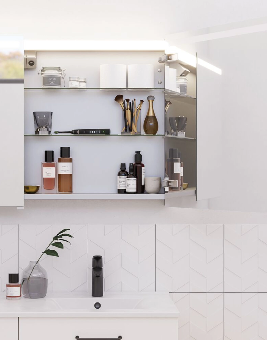 Ta morgenen til nye høyder med speilskapet Top. Speilskapet har en lyslist på toppen, og inne i speilskapet finner du rikelig med oppbevaringsplass og en stikkontakt med bryter. Du får altså mye mer enn du kanskje forventer. Speilskapet fås selvfølgelig med gavler i livlige farger, slik at du kan matche speilskapet med baderomsmøbler og resten av badet.