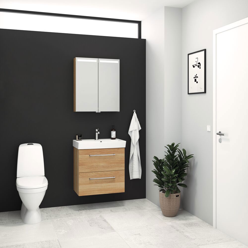 Ta morgenen til nye høyder med speilskapet Top. Speilskapet har en lyslist på toppen, og inne i speilskapet finner du rikelig med oppbevaringsplass og en stikkontakt med bryter. Du får altså mye mer enn du kanskje forventer. Speilskapet fås selvfølgelig med gavler i livlige farger, slik at du kan matche speilskapet med baderomsmøbler og resten av badet.