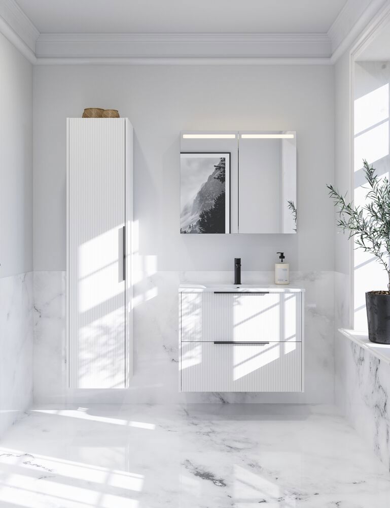 Ta morgenen til nye høyder med speilskapet Top. Speilskapet har en lyslist på toppen, og inne i speilskapet finner du rikelig med oppbevaringsplass og en stikkontakt med bryter. Du får altså mye mer enn du kanskje forventer. Speilskapet fås selvfølgelig med gavler i livlige farger, slik at du kan matche speilskapet med baderomsmøbler og resten av badet.