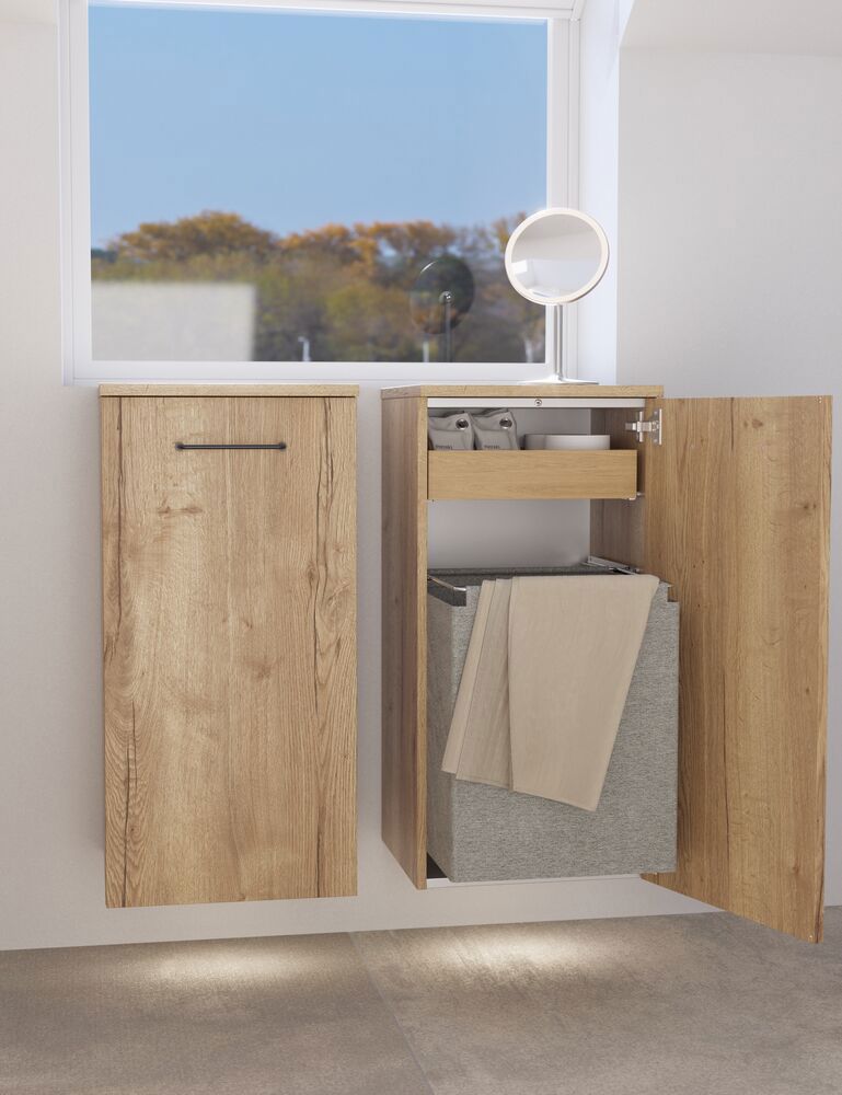 Oppdag funksjonaliteten som underskapet med glatt front i Versjon B tilbyr. Med en bredde på 40 cm og dybde på 35 cm er dette underskapet designet med en praktisk uttrekkbar skuff og en vaskepose, noe som gir ekstra oppbevaringsplass til både kosmetikk og klesvask. De smarte løsningene sørger for at du enkelt kan holde orden på badet ditt og har alt ved hånden når du trenger det. Den glatte fronten tilfører et stilrent design som vil løfte badet ditt, samtidig som den tilbyr optimal oppbevaringsplass. OBS: Det tilkommer en oppstartstillegg (BI1) for produkter med valgfri farge. Det betales én gang per valgfri farge, uansettav antall produkter. Husk å tilføre baderomsmøbelet de små praktiske tingene som du har glede av i hverdagen. For eksempel lys i skuffer og skap, innebygde stikkontakter og dempede sensorlamper under møblene som hjelper deg når du er på badet om natten. Tilvalg bestilles samtidig med møblene dine.