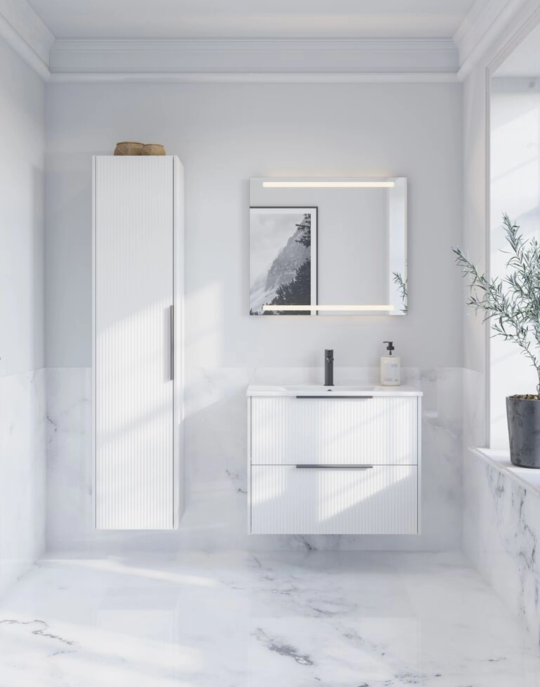 Dette servantskapet kombinerer funksjonalitet og stil med sine 2 romslige skuffer og en elegant stripete front. Dette skapet er tilgjengelig i hvitt, sandfarget eller lyseblått og vil gi badet ditt et moderne og unikt utseende. Skuffene gir rikelig med oppbevaringsplass, og håndtakene er montert og klare til bruk.