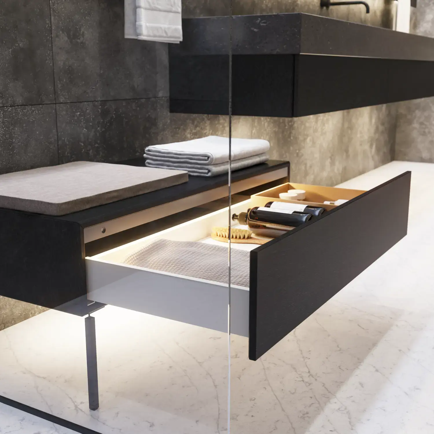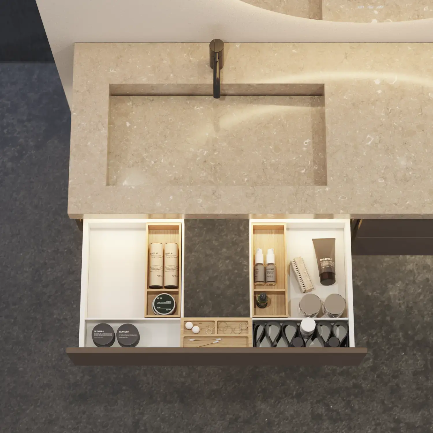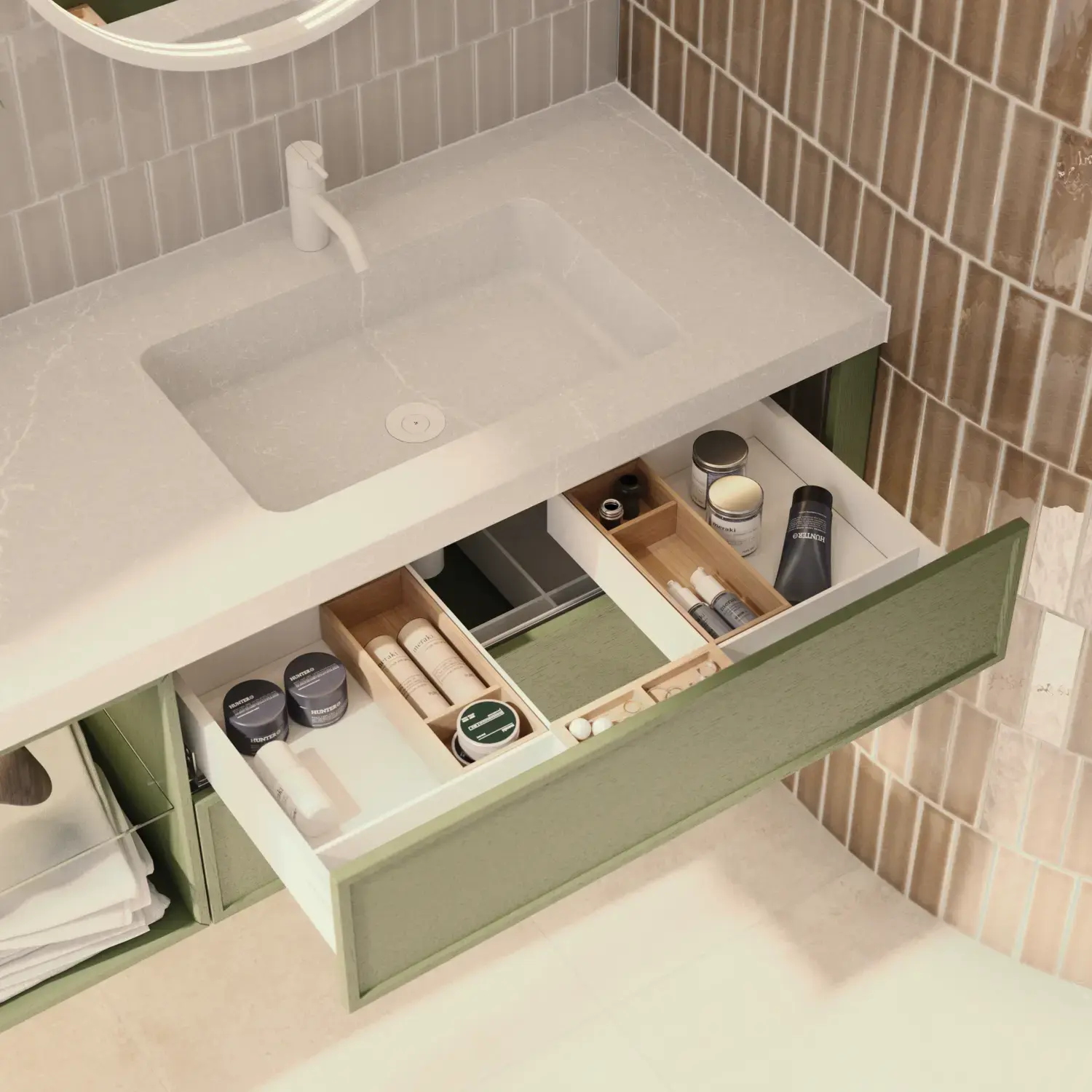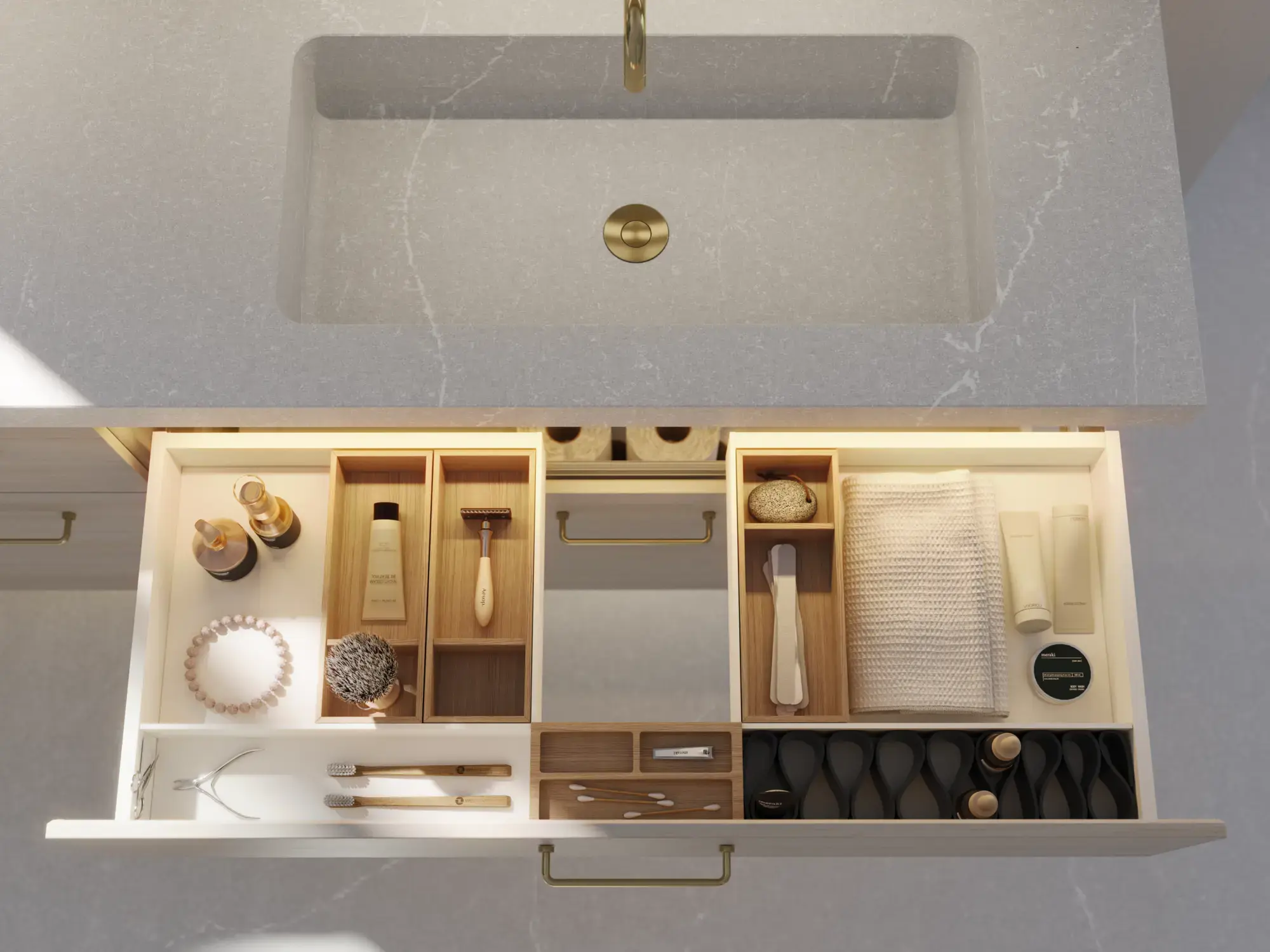 Få kontroll på innholdet i skapene og skuffene dine med lekkert tilbehør som gir deg en større brukeropplevelse og gjør det enkelt å holde et eksklusivt bad rent og pent.