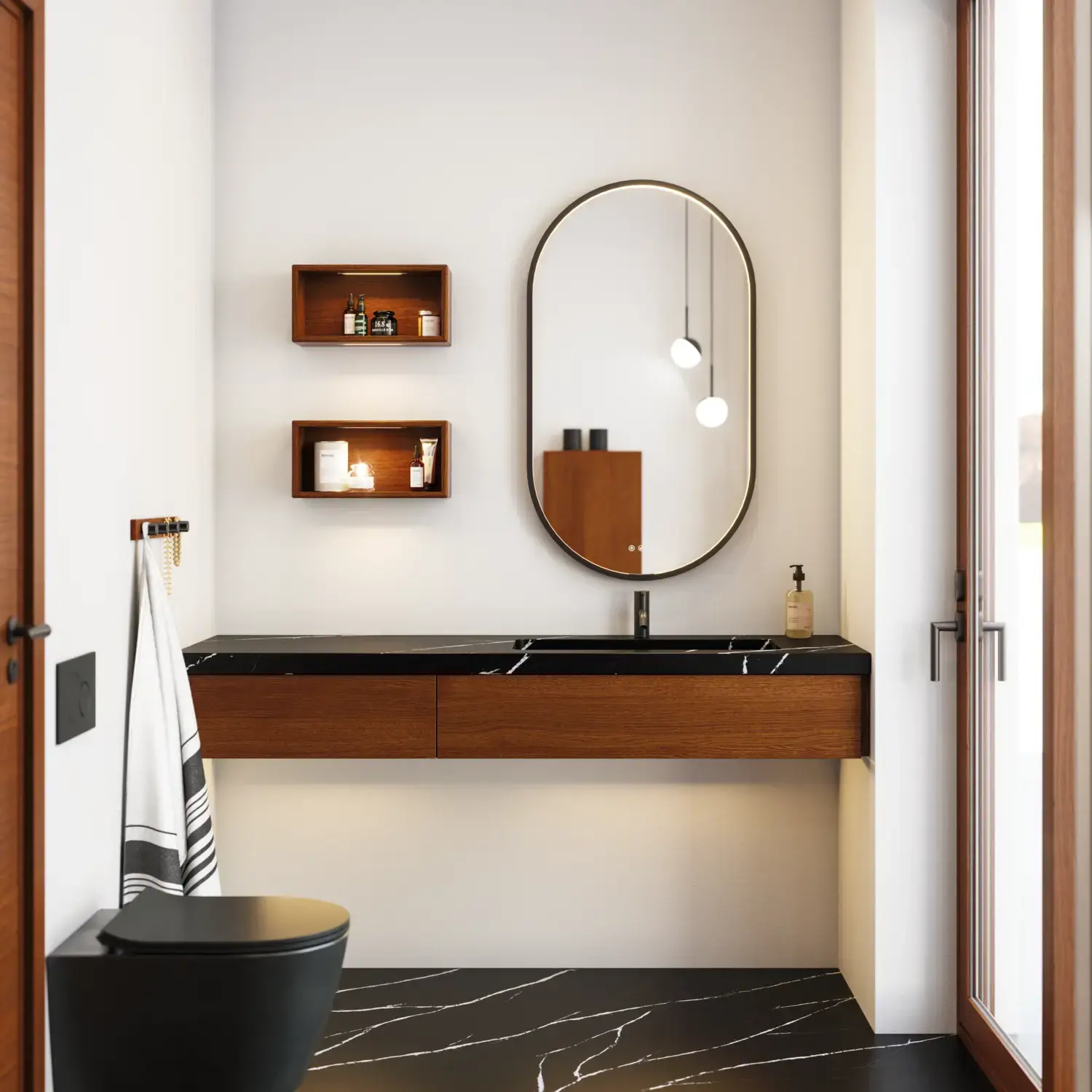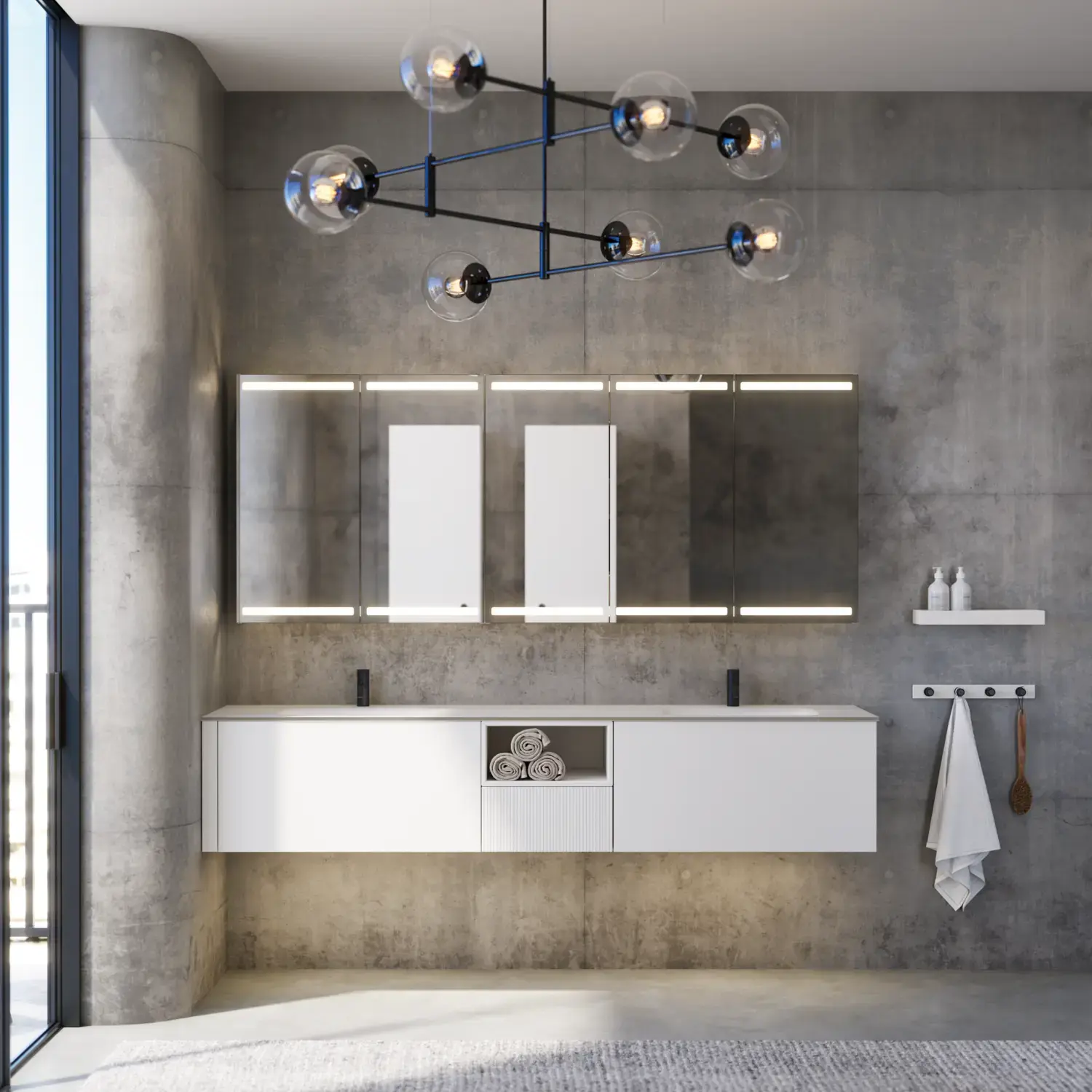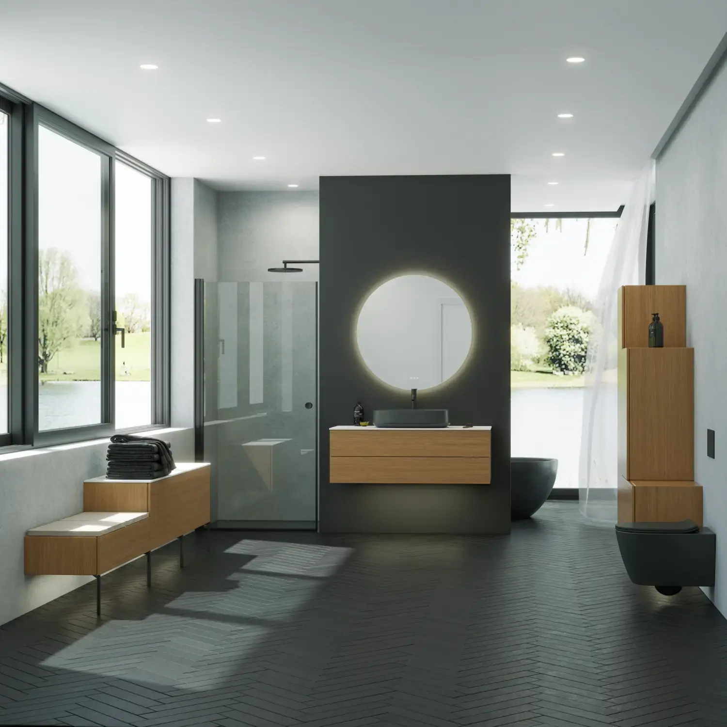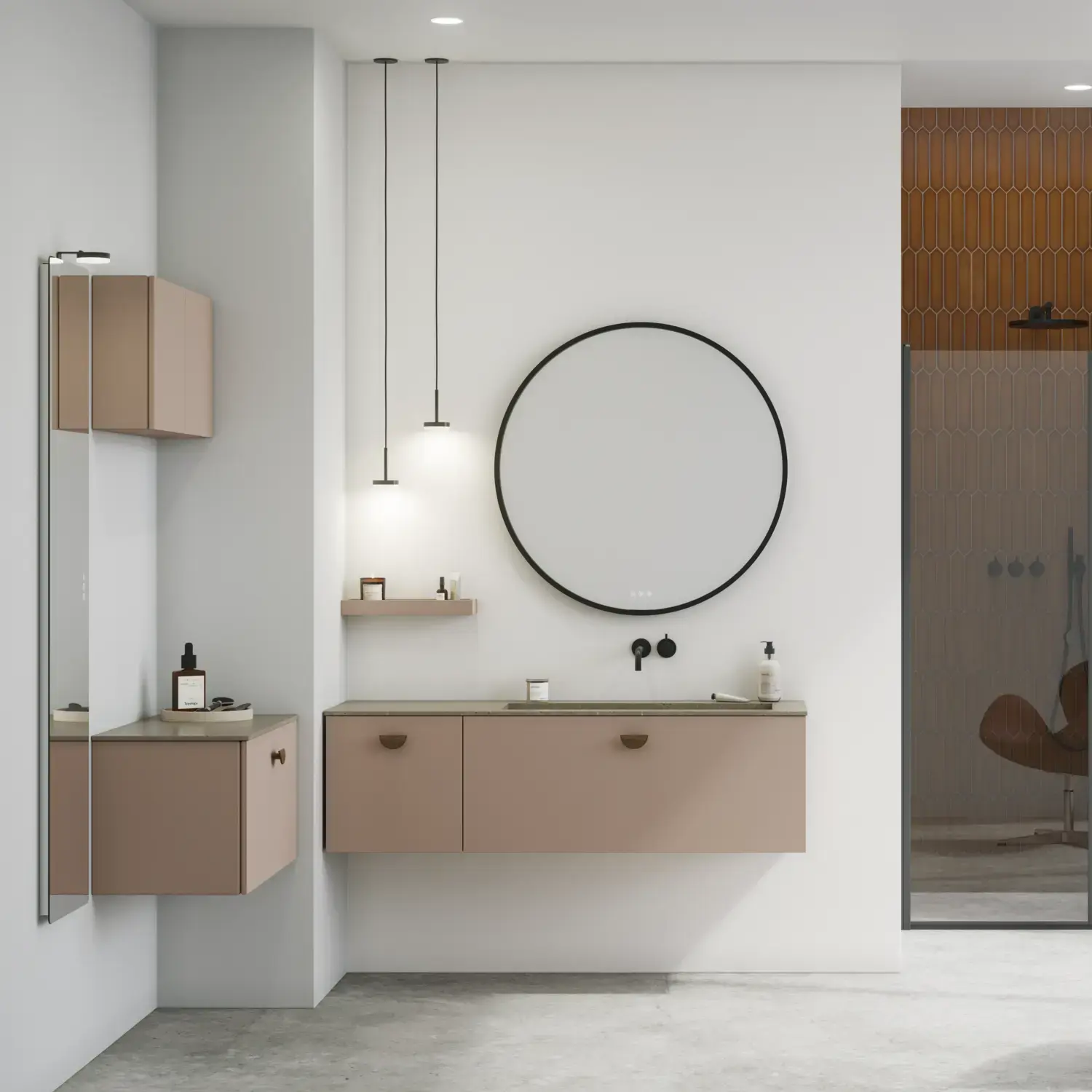 De runde formene på Moon-speilet og det nye, eksklusive Demi-håndtaket i tre gir badet en rolig balanse og et snev av varme.