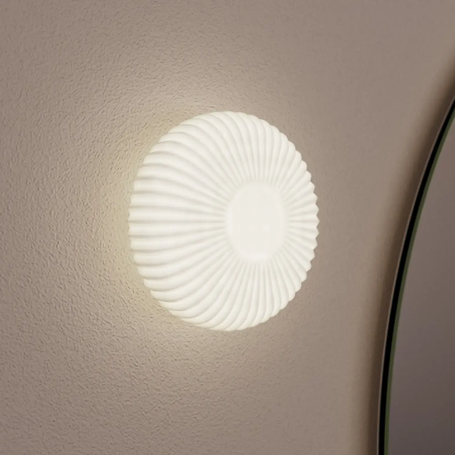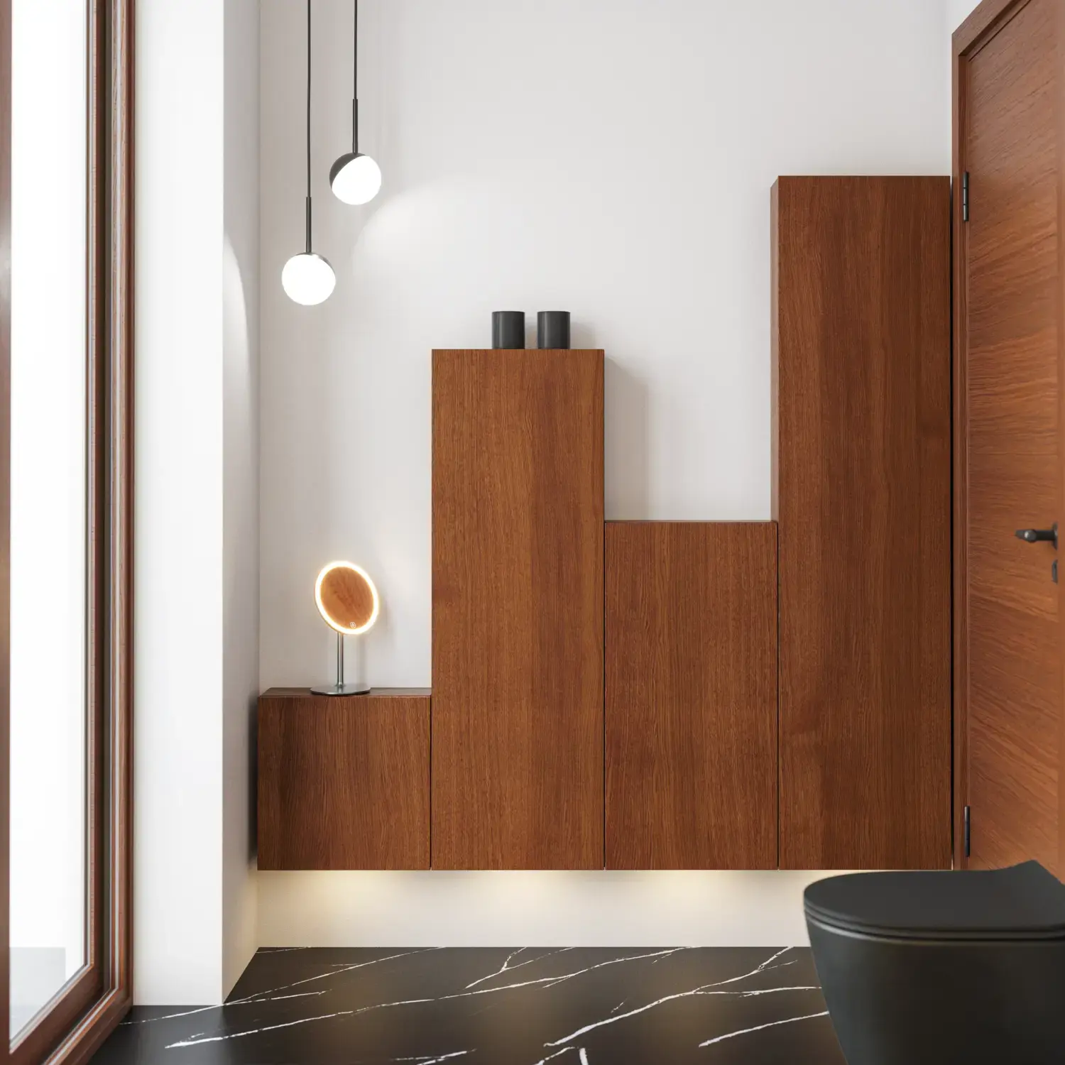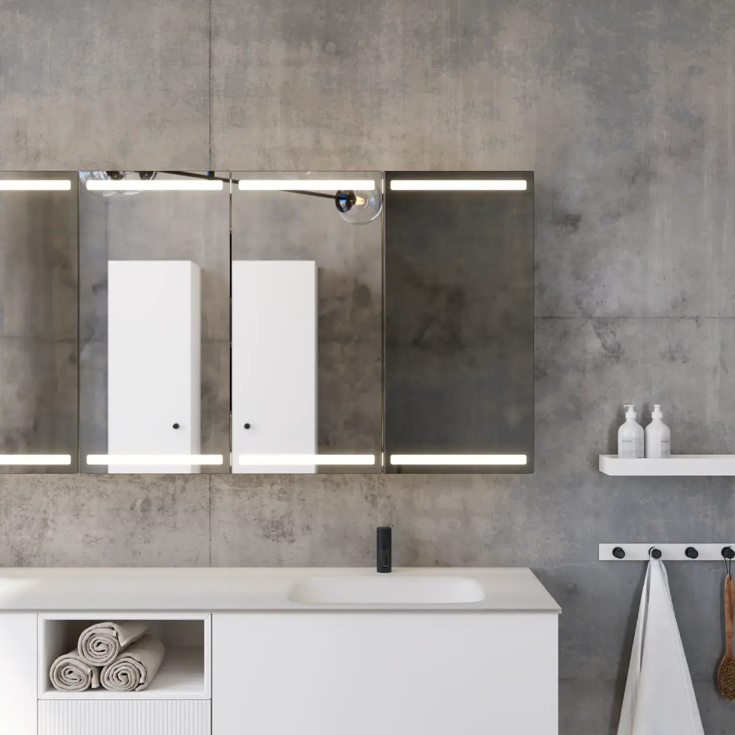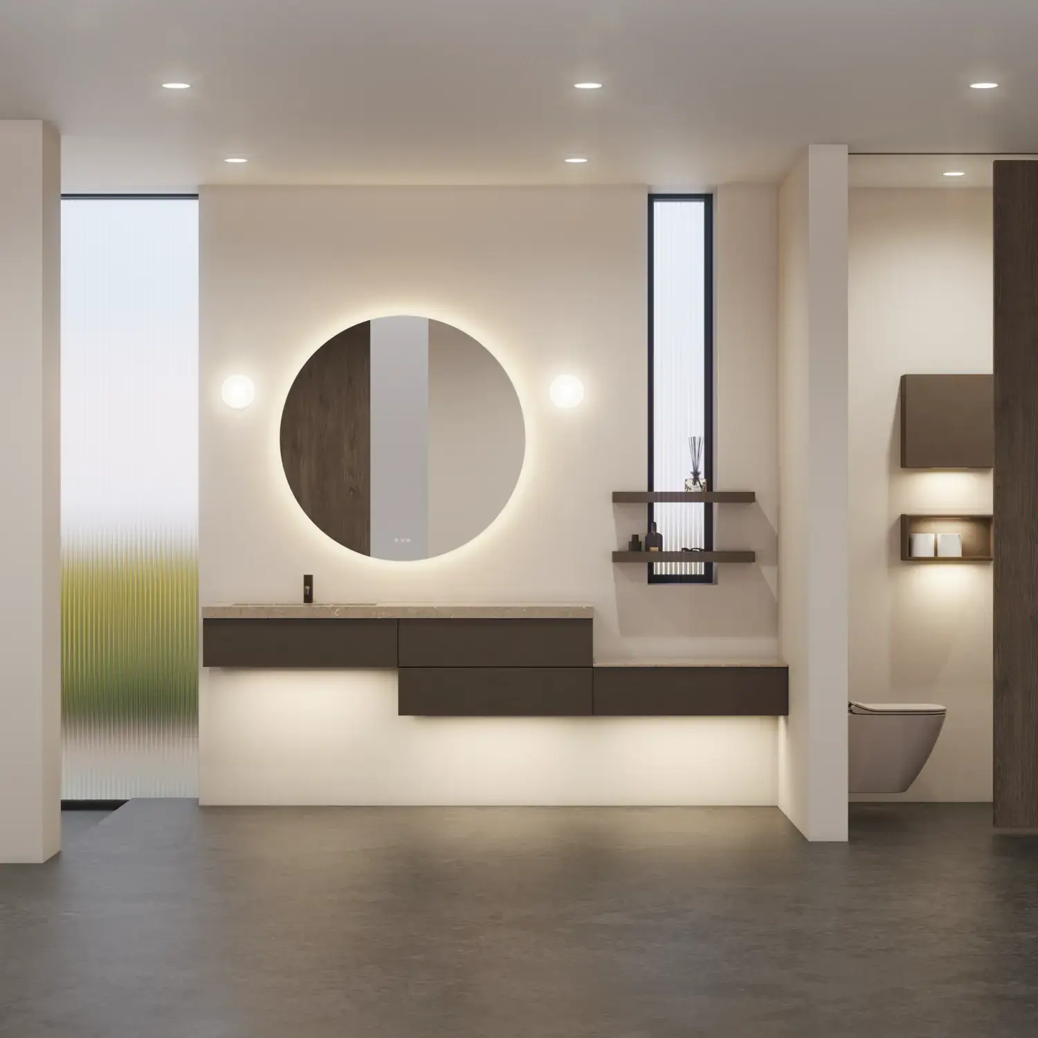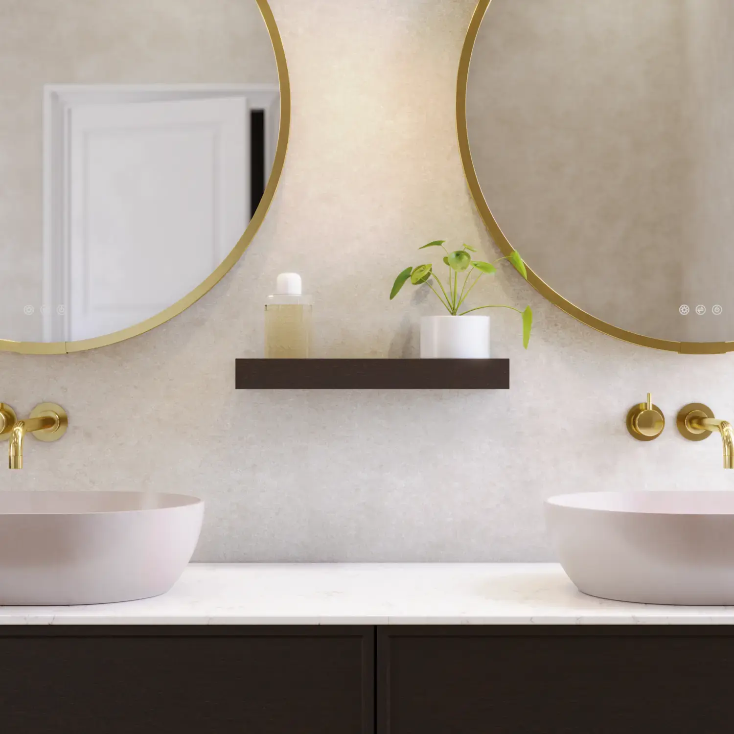 De runde formene på Moon-speilet og det nye, eksklusive Demi-håndtaket i tre gir badet en rolig balanse og et snev av varme.