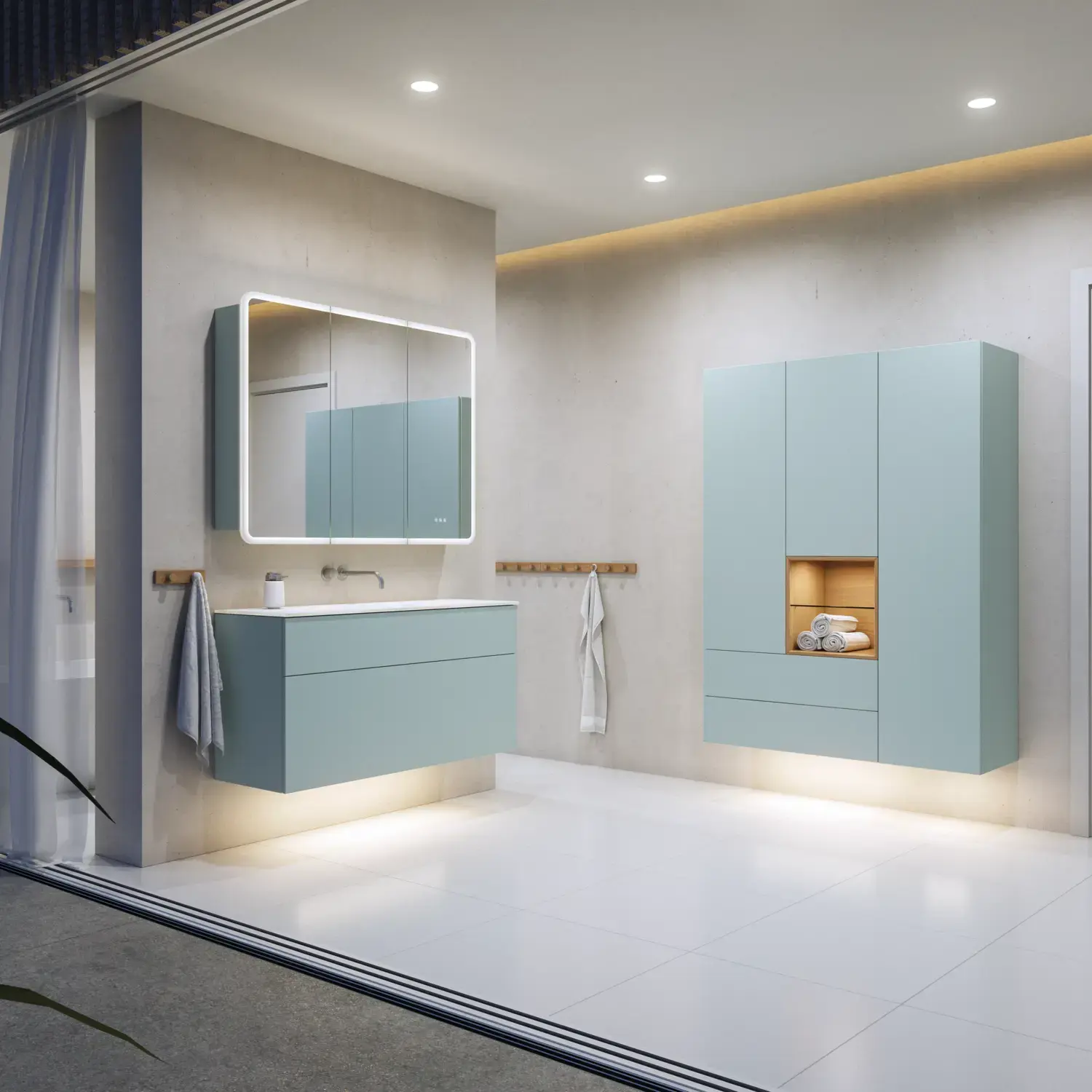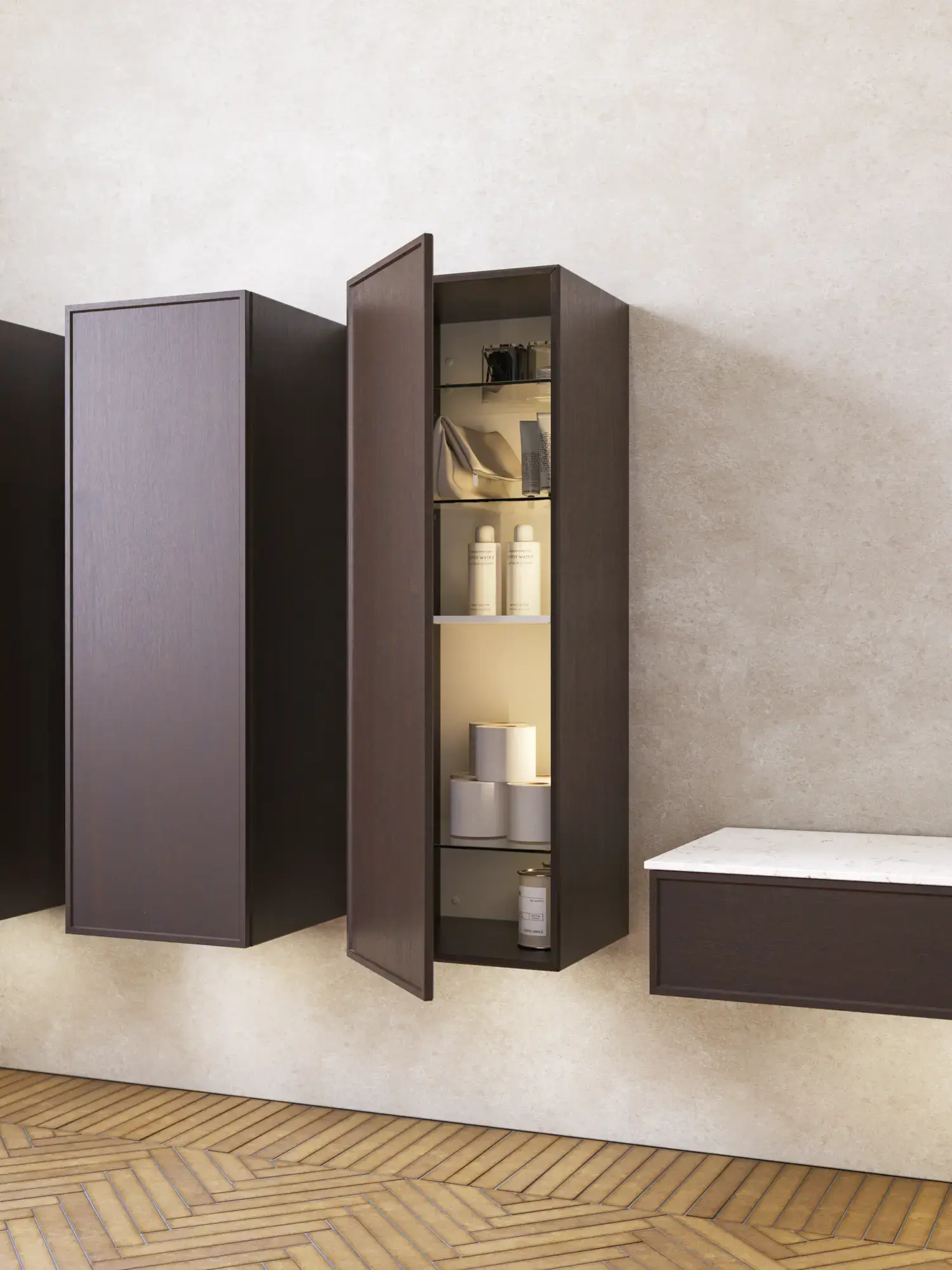 Når estetikk og funksjon smelter sammen, oppstår et rom i perfekt balanse. Med Calidris kan du innrede hele badet i ett sammenhengende uttrykk – fra de elegante speilskapene og åpne hyllene til de svevende høyskapene med lys under. De rene linjene, de taktile frontene og de gjennomtenkte detaljene skaper en atmosfære av ro og eksklusivitet.