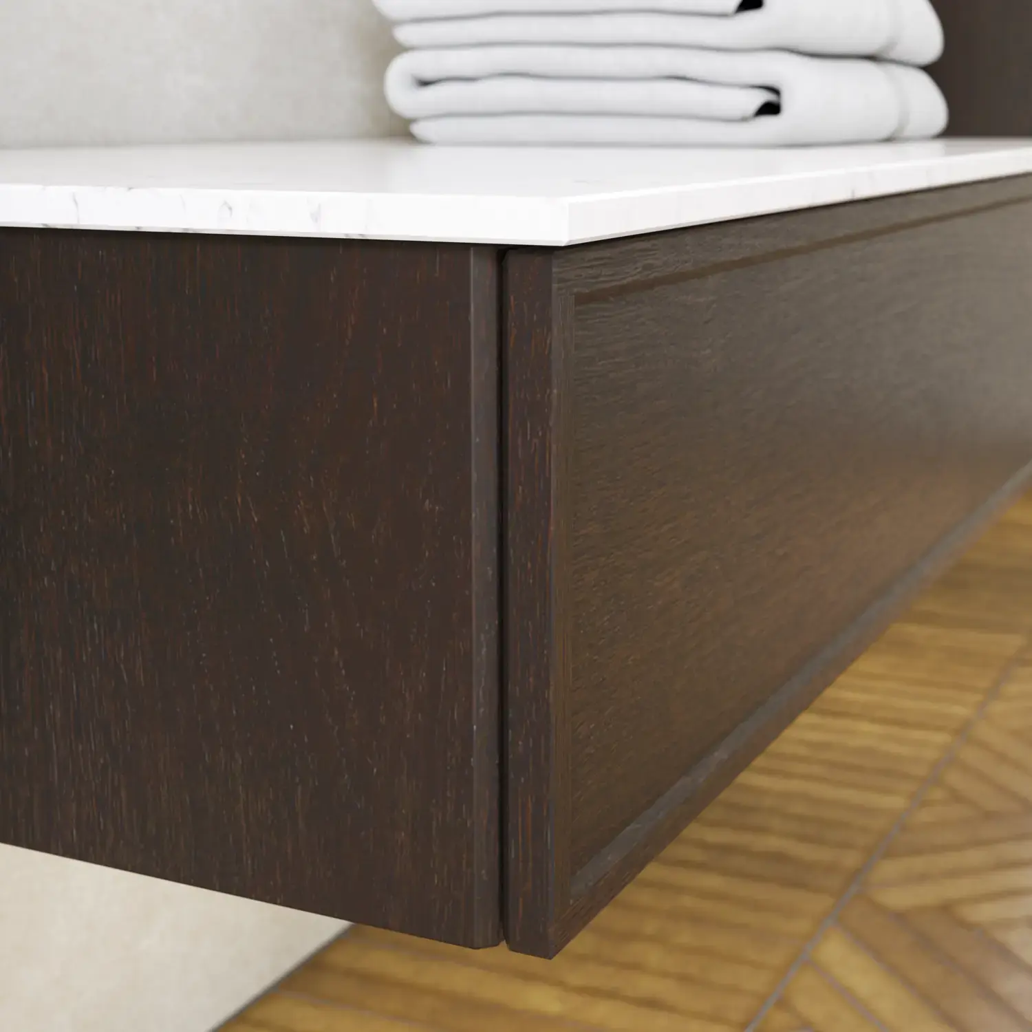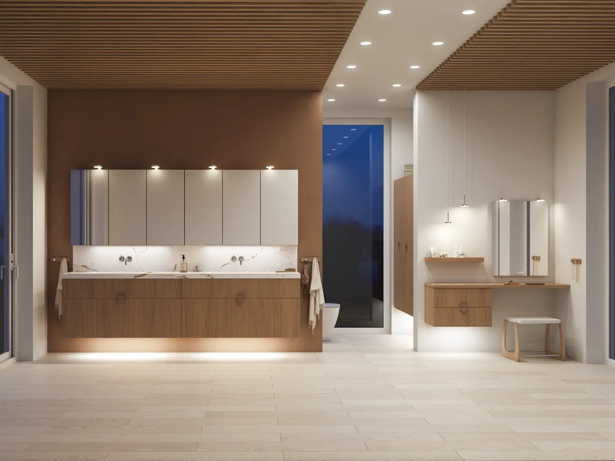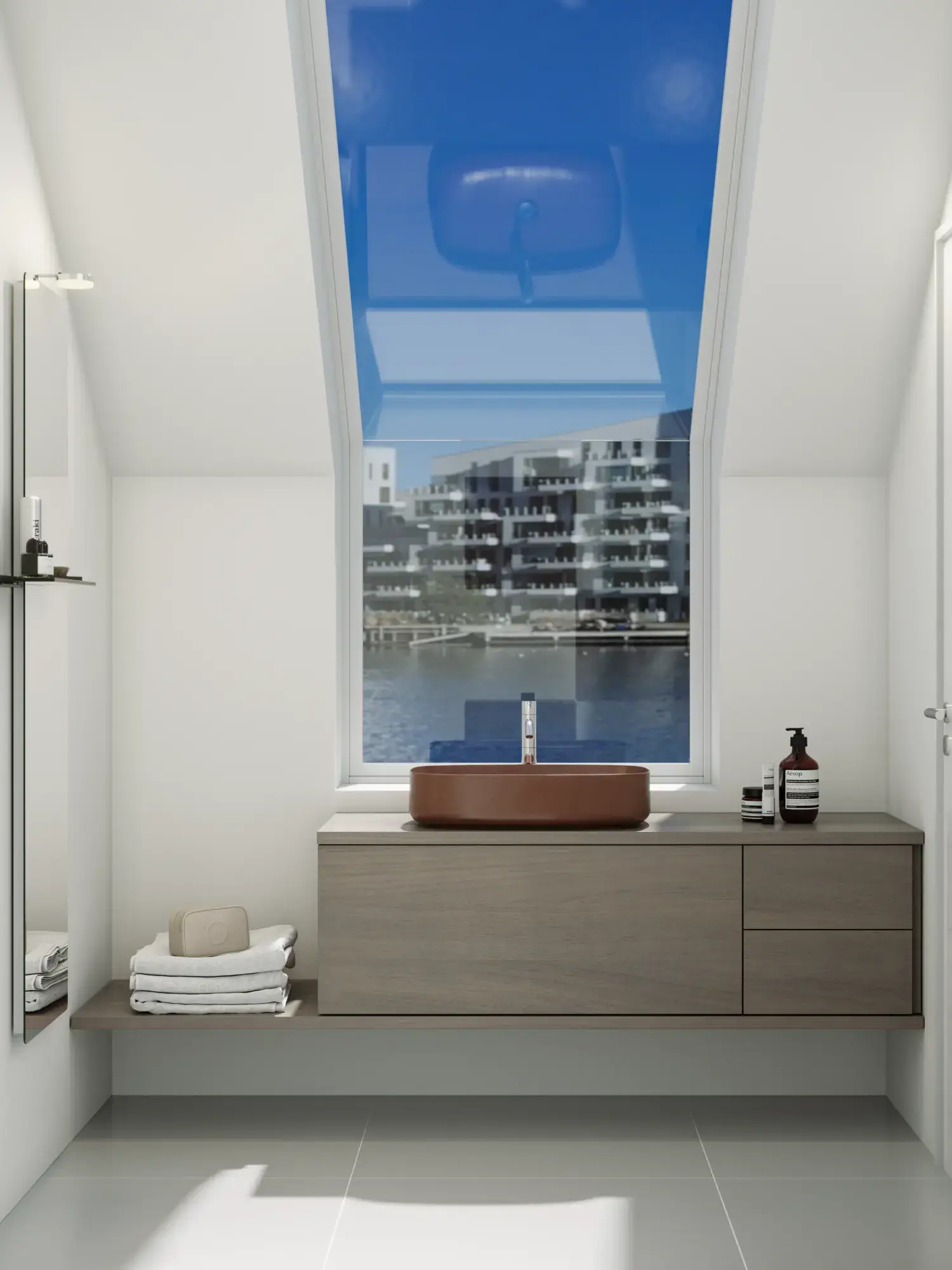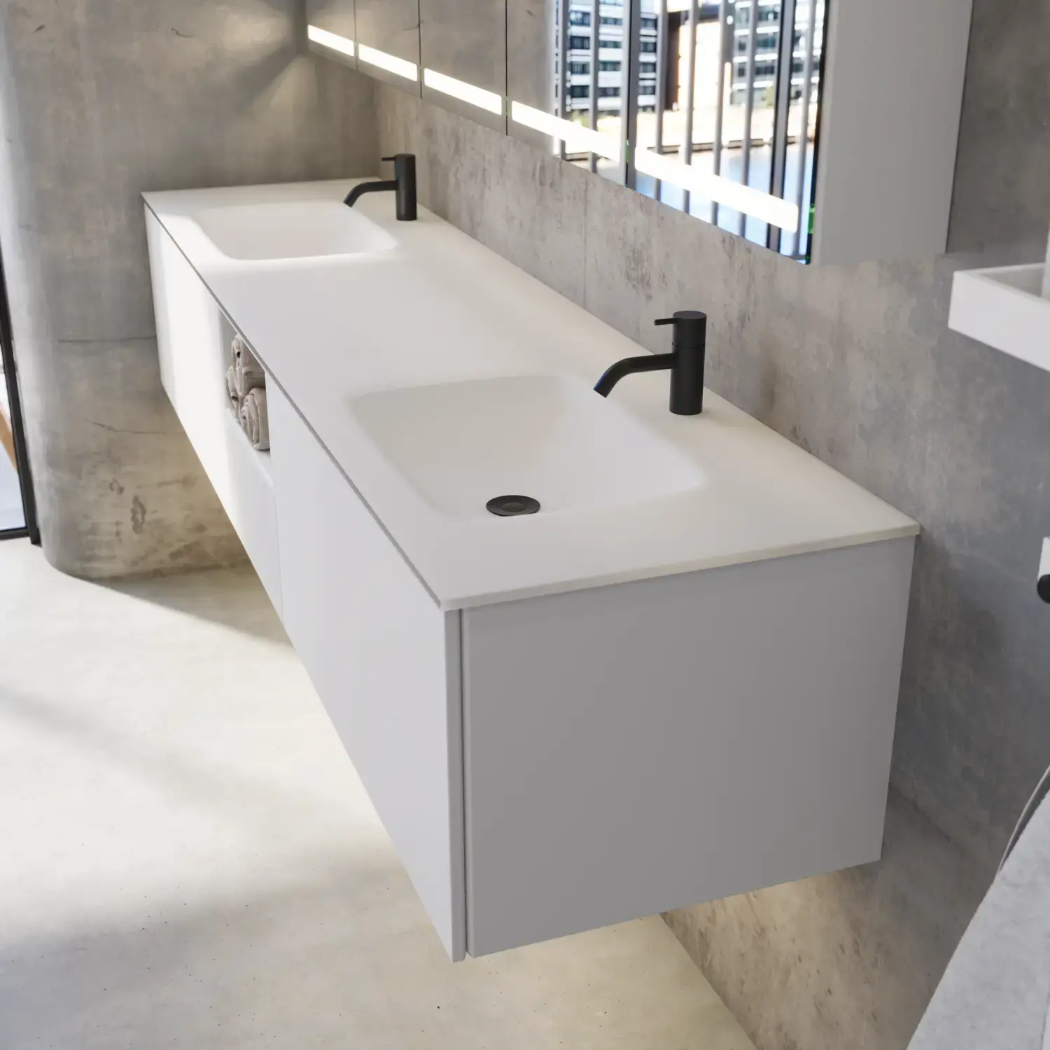 Den vakre servanten setter tonen for et moderne bad, hvor estetikk og funksjon går hånd i hånd. Det svevende designet og de horisontale linjene skaper en lett og arkitektonisk balanse – et trendy utseende som føles både eksklusivt og naturlig på samme tid.
