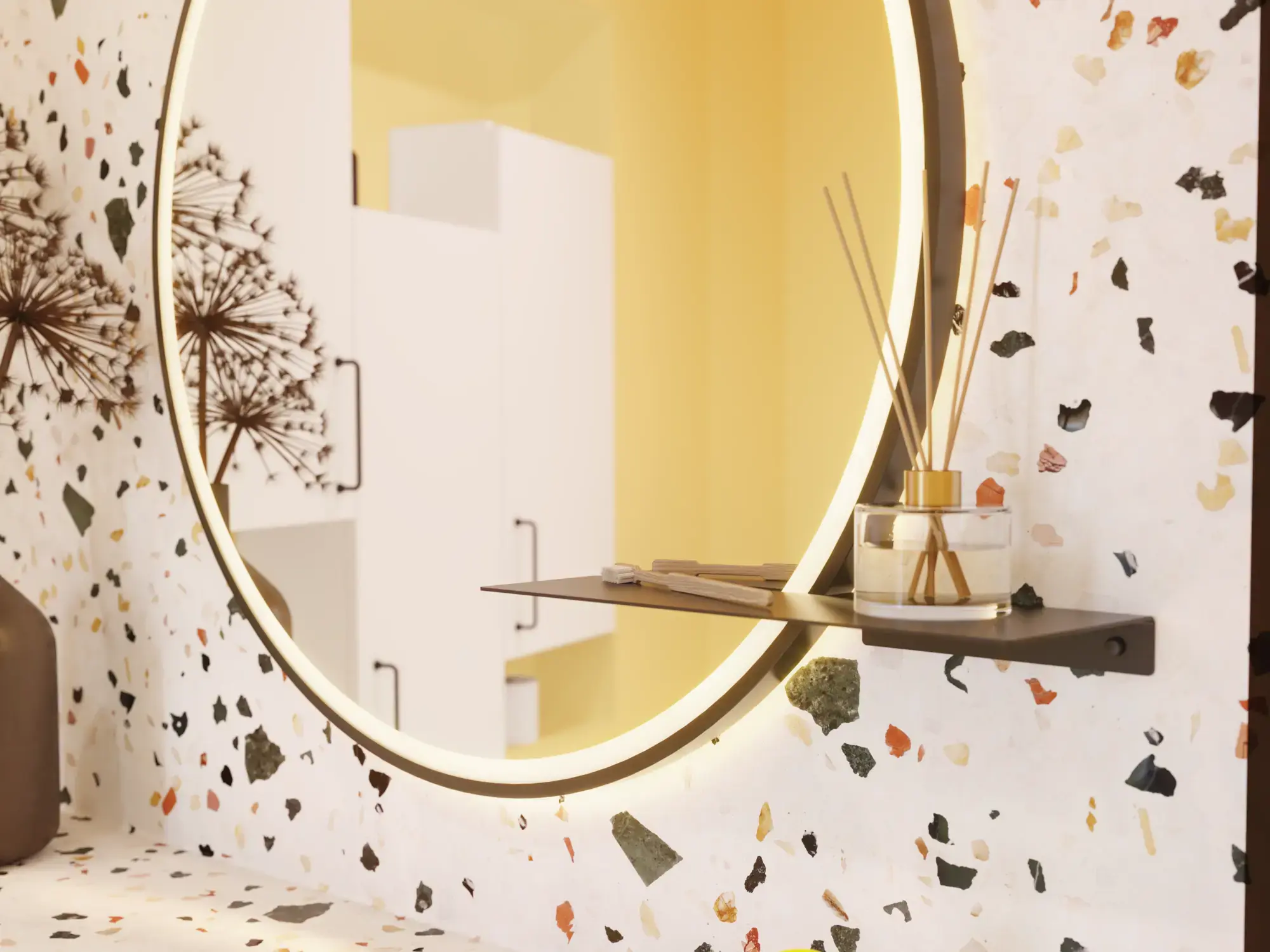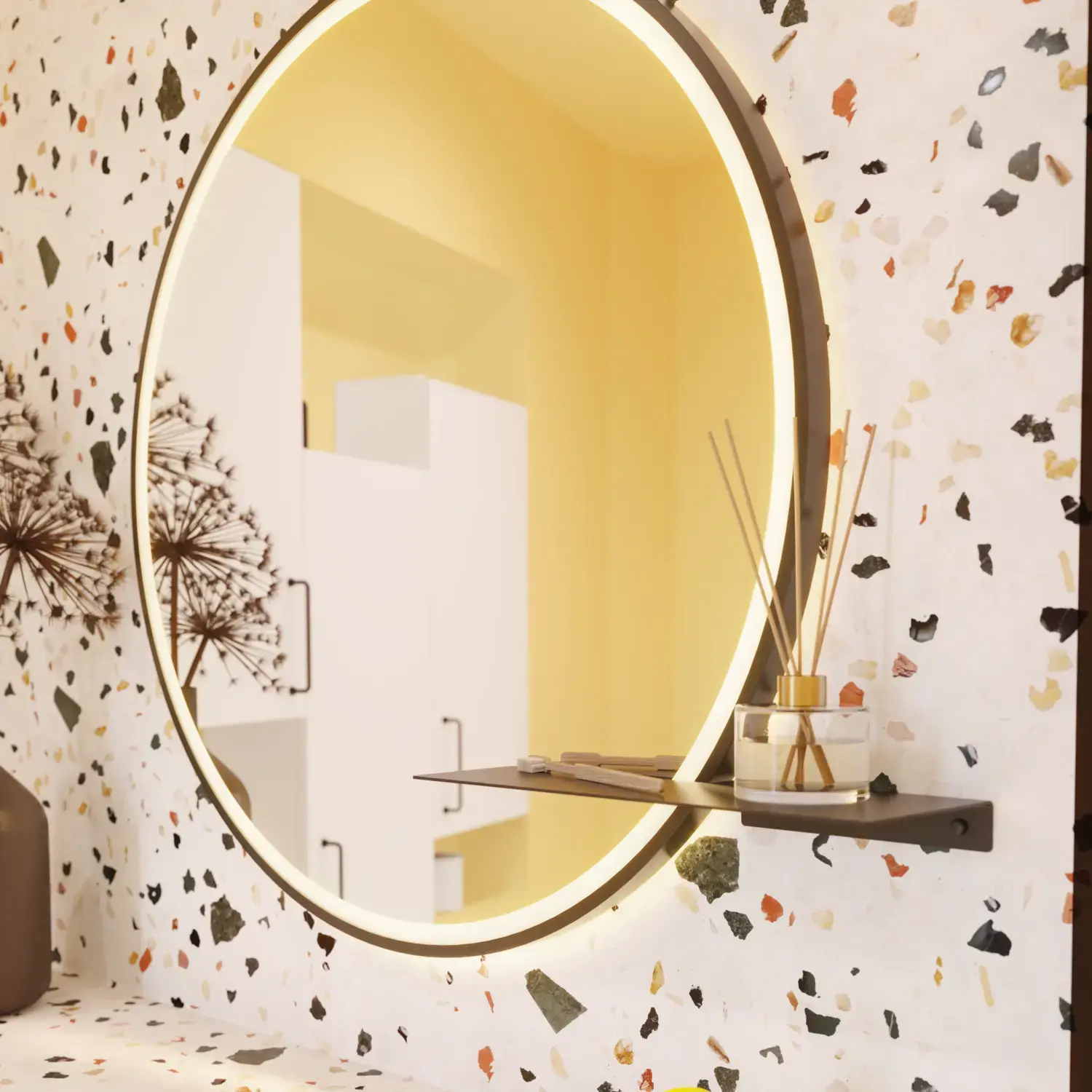 Den fikse lille Chic metallhyllen plasseres halvveis innover speilet og er perfekt til brillene og en flaske med duftpinner.